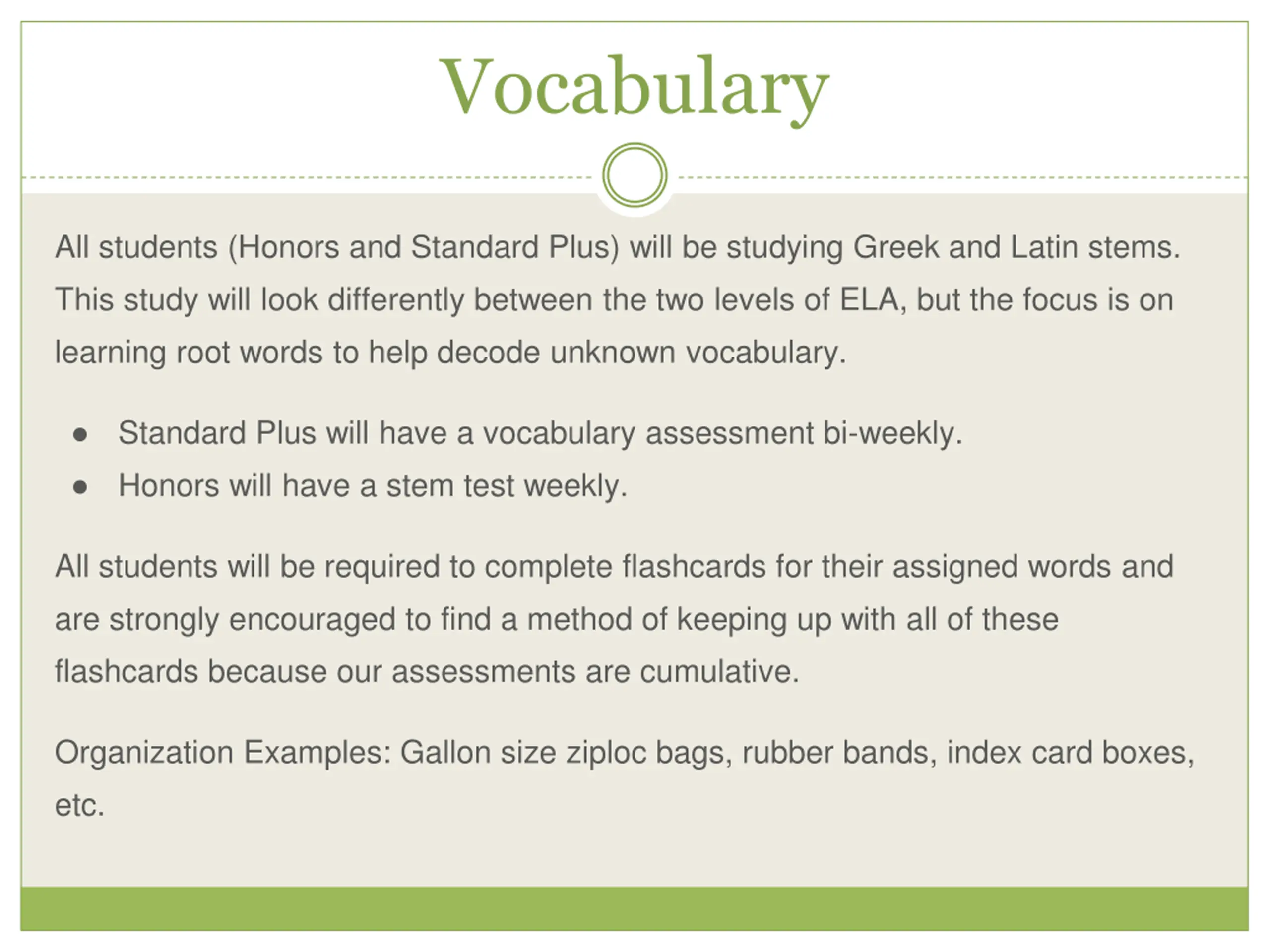 Vocabulary All students (Honors and Standard Plus) will be studying Greek and Latin stems. This study will look differently between the two levels of ELA, but the focus is on learning root words to help decode unknown vocabulary. Standard Plus will have a vocabulary assessment bi-weekly. Honors will have a stem test weekly. All students will be required to complete flashcards for their assigned words and are strongly encouraged to find a method of keeping up with all of these flashcards because our assessments are cumulative. Organization Examples: Gallon size ziploc bags, rubber bands, index card boxes, etc.