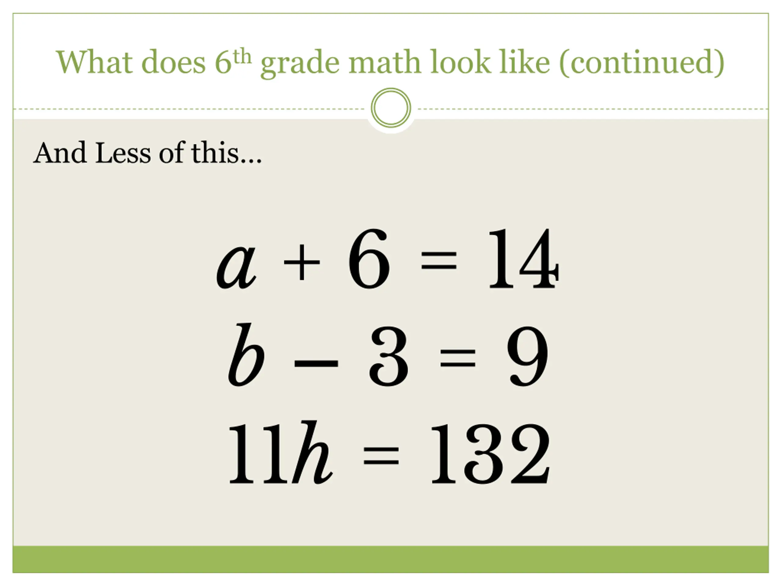 What does 6thgrade math look like (continued) And Less of this a + 6 = 14 b 3 = 9 11h = 132