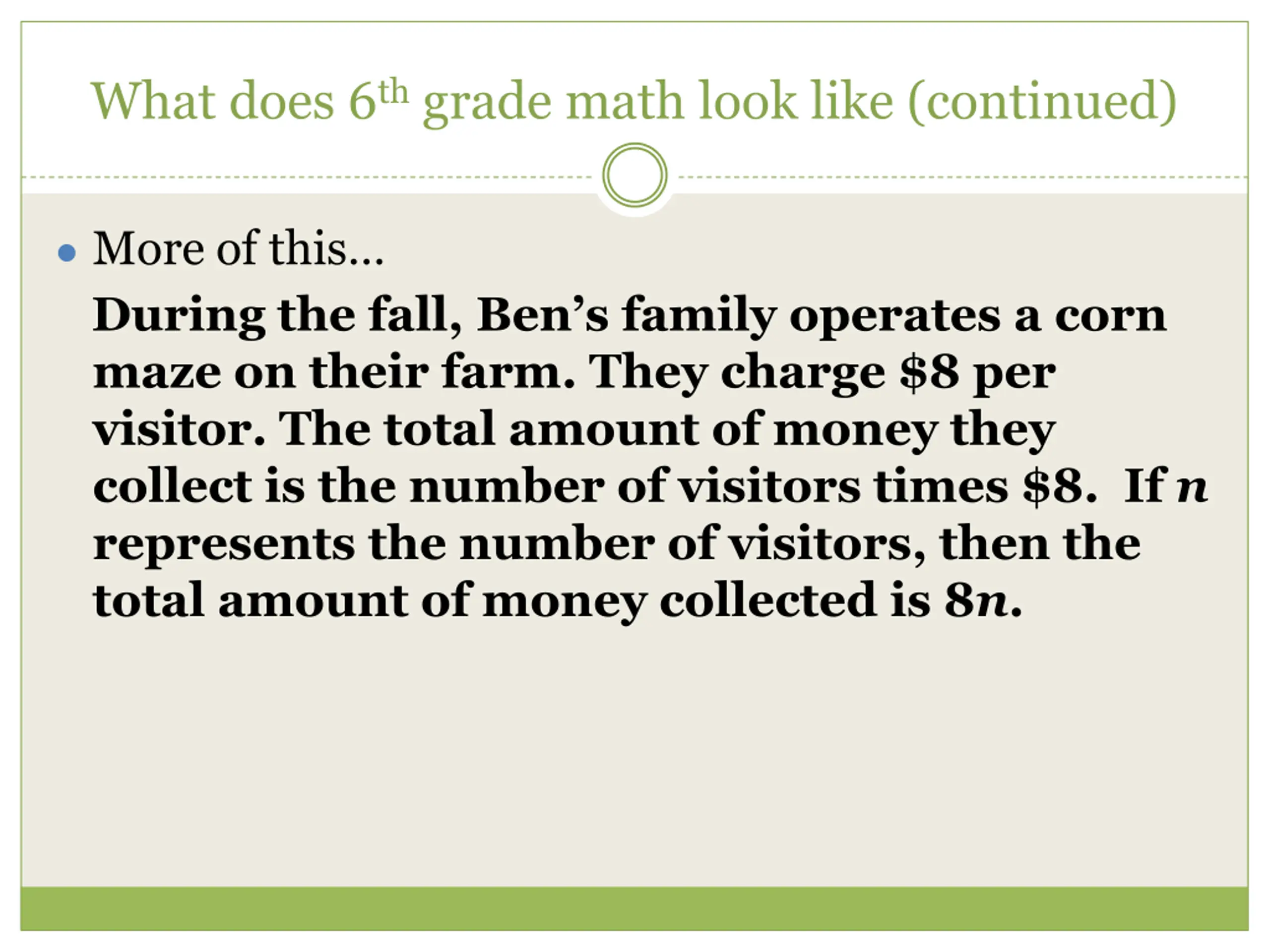 What does 6thgrade math look like (continued) More of this During the fall, Ben s family operates a corn maze on their farm. They charge $8 per visitor. The total amount of money they collect is the number of visitors times $8. If n represents the number of visitors, then the total amount of money collected is 8n.