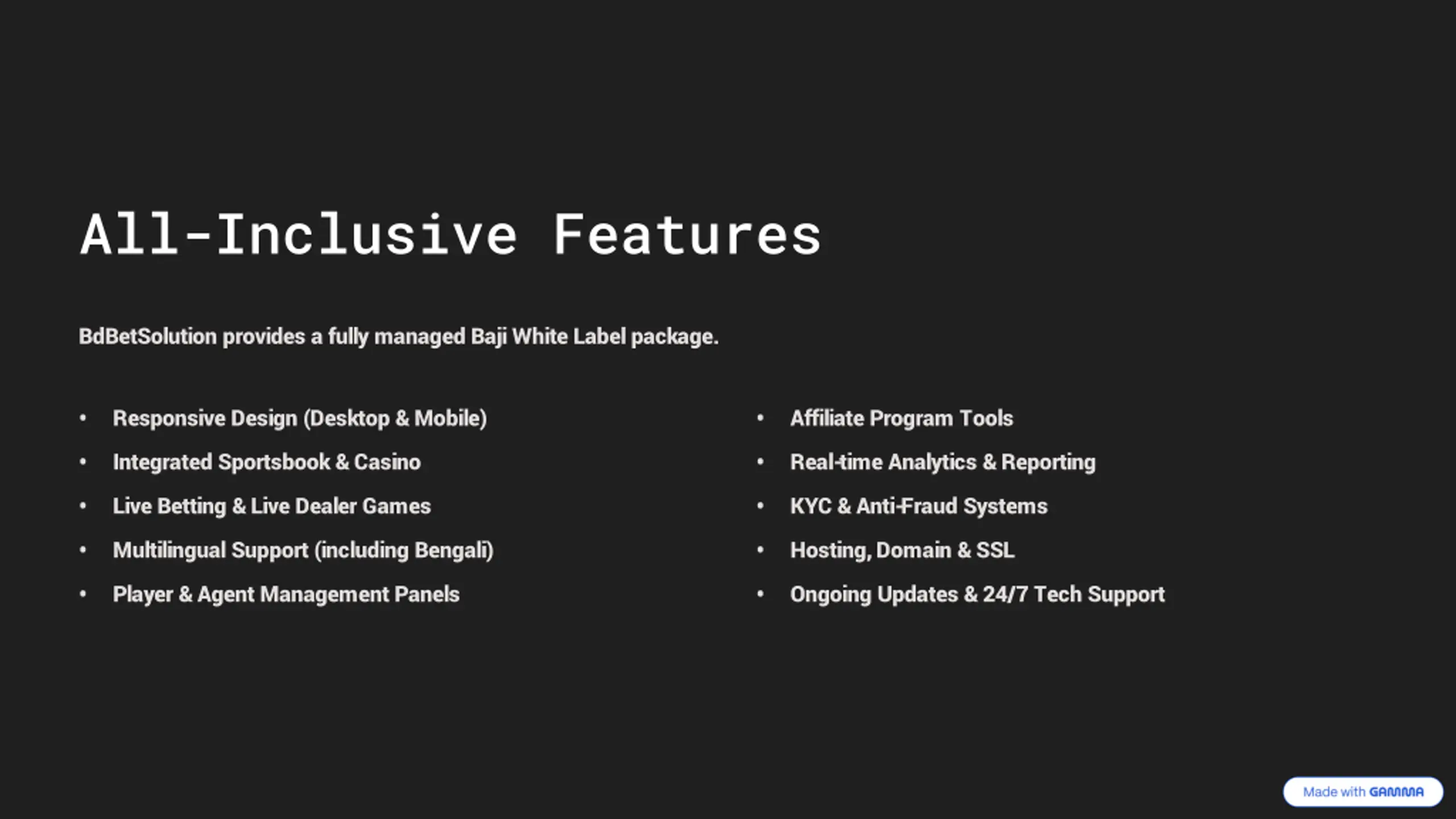 All-Inclusive Features BdBetSolution provides a fully managed Baji White Label package. Responsive Design (Desktop & Mobile) Affiliate Program Tools Integrated Sportsbook & Casino Real-time Analytics & Reporting Live Betting & Live Dealer Games KYC & Anti-Fraud Systems Multilingual Support (including Bengali) Hosting, Domain & SSL Player & Agent Management Panels Ongoing Updates & 24/7 Tech Support preencoded.png