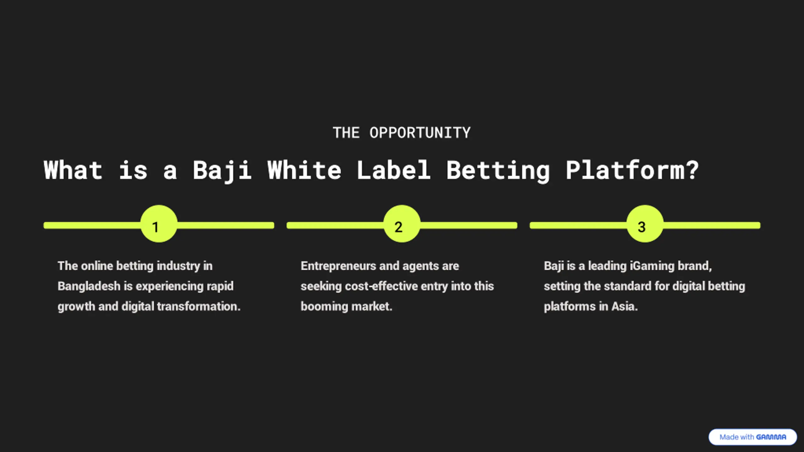 THE OPPORTUNITY What is a Baji White Label Betting Platform? What is a Baji White Label Betting Platform? 1 2 3 The online betting industry in Bangladesh is experiencing rapid growth and digital transformation. Entrepreneurs and agents are seeking cost-effective entry into this booming market. Baji is a leading iGaming brand, setting the standard for digital betting platforms in Asia. preencoded.png