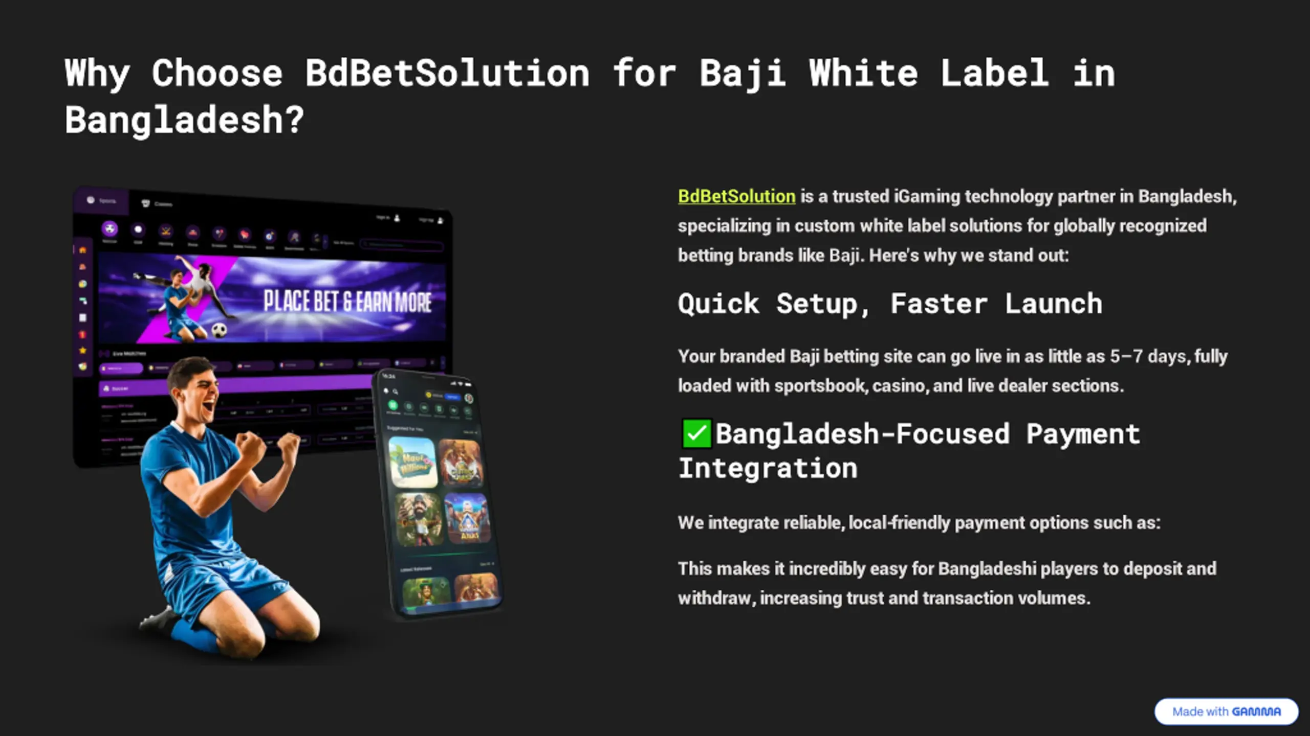 Why Choose BdBetSolution for Baji White Label in Why Choose BdBetSolution for Baji White Label in Bangladesh? Bangladesh? BdBetSolution is a trusted iGaming technology partner in Bangladesh, specializing in custom white label solutions for globally recognized betting brands like Baji. Here's why we stand out: Quick Setup, Faster Launch Quick Setup, Faster Launch Your branded Baji betting site can go live in as little as 5 7 days, fully loaded with sportsbook, casino, and live dealer sections. Bangladesh Bangladesh- -Focused Payment Focused Payment Integration Integration We integrate reliable, local-friendly payment options such as: This makes it incredibly easy for Bangladeshi players to deposit and withdraw, increasing trust and transaction volumes. preencoded.png
