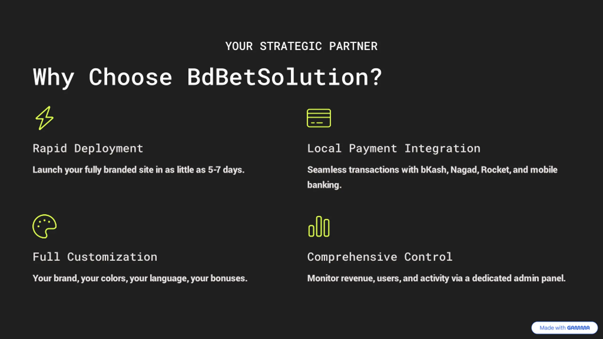 YOUR STRATEGIC PARTNER Why Choose BdBetSolution? Rapid Deployment Local Payment Integration Launch your fully branded site in as little as 5-7 days. Seamless transactions with bKash, Nagad, Rocket, and mobile banking. Full Customization Comprehensive Control Your brand, your colors, your language, your bonuses. Monitor revenue, users, and activity via a dedicated admin panel. preencoded.png