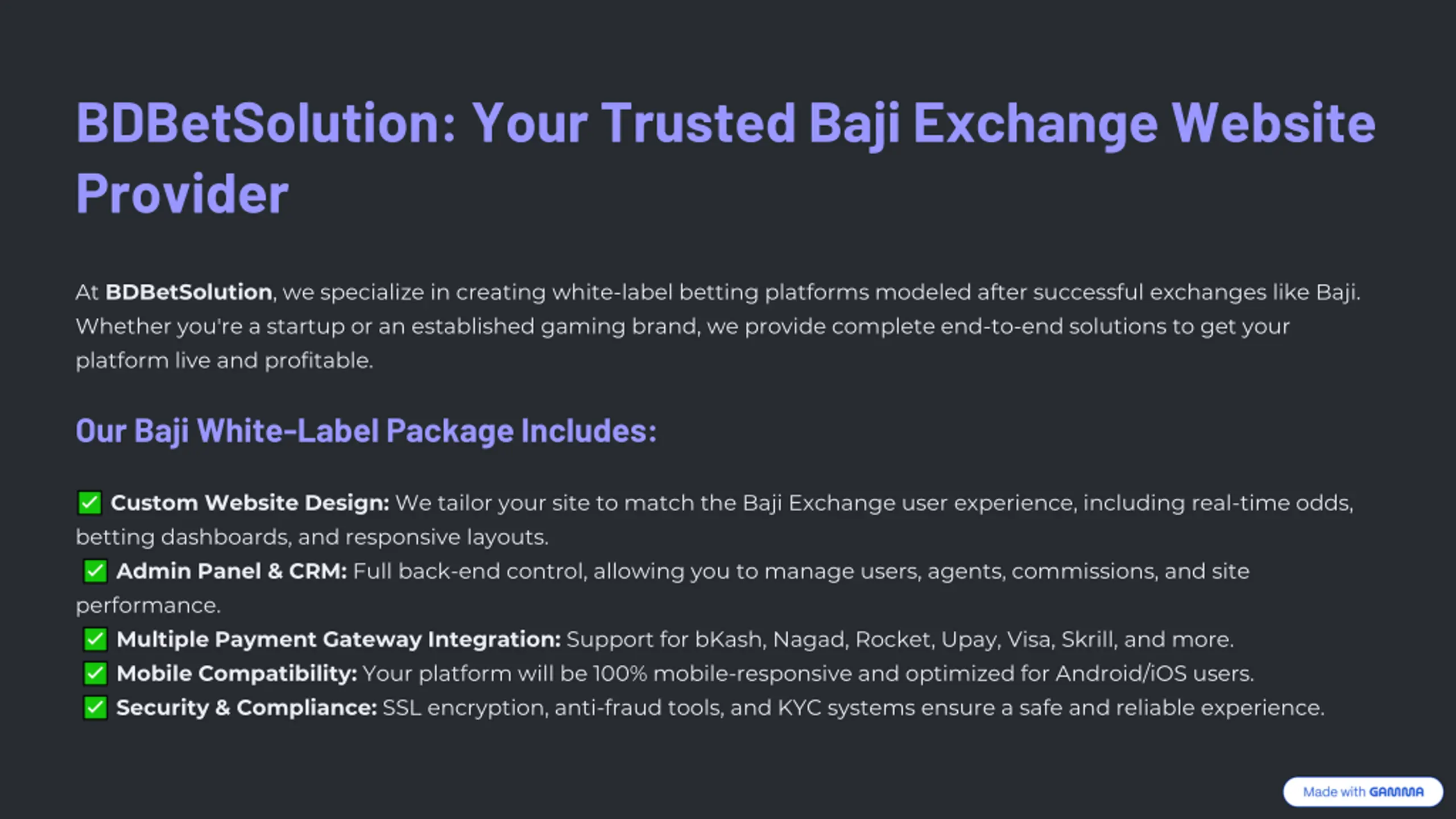 BDBetSolution: Your Trusted Baji Exchange Website Provider At BDBetSolution, we specialize in creating white-label betting platforms modeled after successful exchanges like Baji. Whether you're a startup or an established gaming brand, we provide complete end-to-end solutions to get your platform live and profitable. Our Baji White-Label Package Includes: Custom Website Design: We tailor your site to match the Baji Exchange user experience, including real-time odds, betting dashboards, and responsive layouts. Admin Panel & CRM: Full back-end control, allowing you to manage users, agents, commissions, and site performance. Multiple Payment Gateway Integration: Support for bKash, Nagad, Rocket, Upay, Visa, Skrill, and more. Mobile Compatibility: Your platform will be 100% mobile-responsive and optimized for Android/iOS users. Security & Compliance: SSL encryption, anti-fraud tools, and KYC systems ensure a safe and reliable experience. preencoded.png