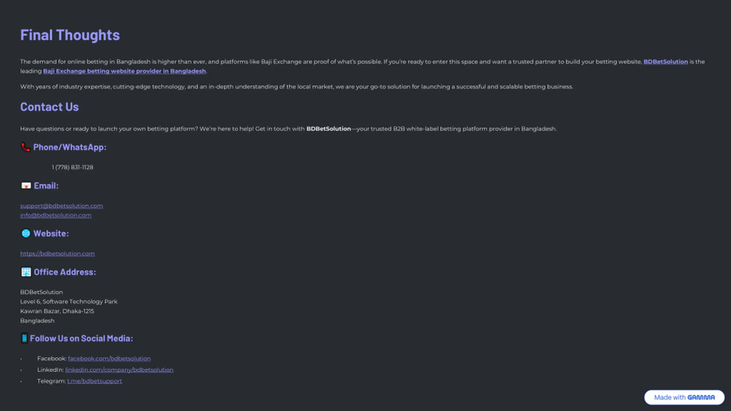 Final Thoughts The demand for online betting in Bangladesh is higher than ever, and platforms like Baji Exchange are proof of what s possible. If you re ready to enter this space and want a trusted partner to build your betting website, BDBetSolution is the leading Baji Exchange betting website provider in Bangladesh. With years of industry expertise, cutting-edge technology, and an in-depth understanding of the local market, we are your go-to solution for launching a successful and scalable betting business. Contact Us Have questions or ready to launch your own betting platform? We re here to help! Get in touch with BDBetSolution your trusted B2B white-label betting platform provider in Bangladesh. Phone/WhatsApp: 1 (778) 831-1128 Email: support@bdbetsolution.com info@bdbetsolution.com Website: https://bdbetsolution.com Office Address: BDBetSolution Level 6, Software Technology Park Kawran Bazar, Dhaka-1215 Bangladesh Follow Us on Social Media: Facebook: facebook.com/bdbetsolution LinkedIn: linkedin.com/company/bdbetsolution Telegram: t.me/bdbetsupport preencoded.png
