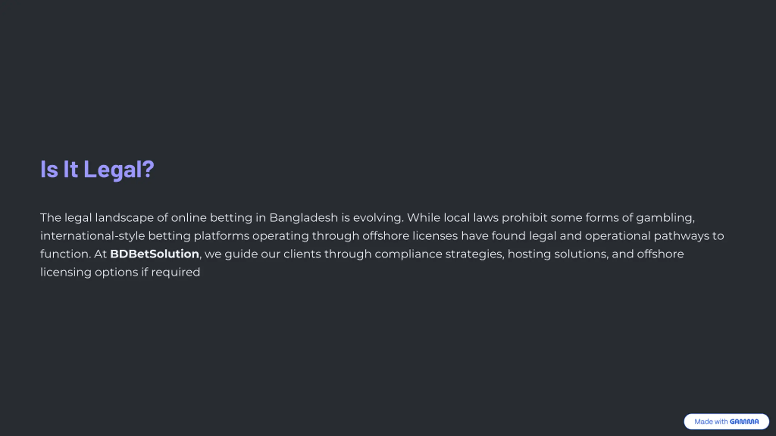 Is It Legal? The legal landscape of online betting in Bangladesh is evolving. While local laws prohibit some forms of gambling, international-style betting platforms operating through offshore licenses have found legal and operational pathways to function. At BDBetSolution, we guide our clients through compliance strategies, hosting solutions, and offshore licensing options if required preencoded.png