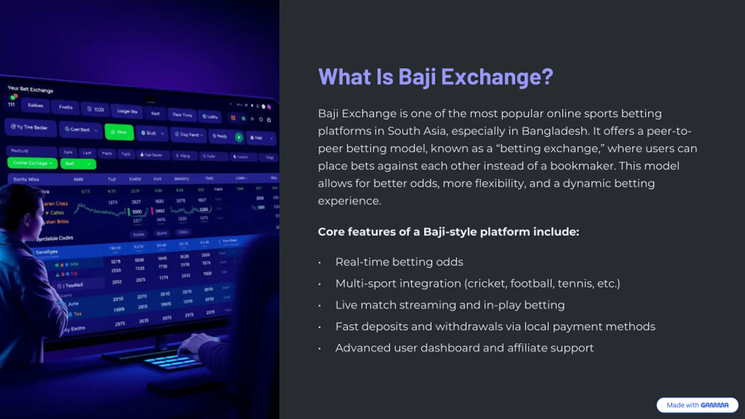 What Is Baji Exchange? Baji Exchange is one of the most popular online sports betting platforms in South Asia, especially in Bangladesh. It offers a peer-to- peer betting model, known as a betting exchange, where users can place bets against each other instead of a bookmaker. This model allows for better odds, more flexibility, and a dynamic betting experience. Core features of a Baji-style platform include: Real-time betting odds Multi-sport integration (cricket, football, tennis, etc.) Live match streaming and in-play betting Fast deposits and withdrawals via local payment methods Advanced user dashboard and affiliate support preencoded.png