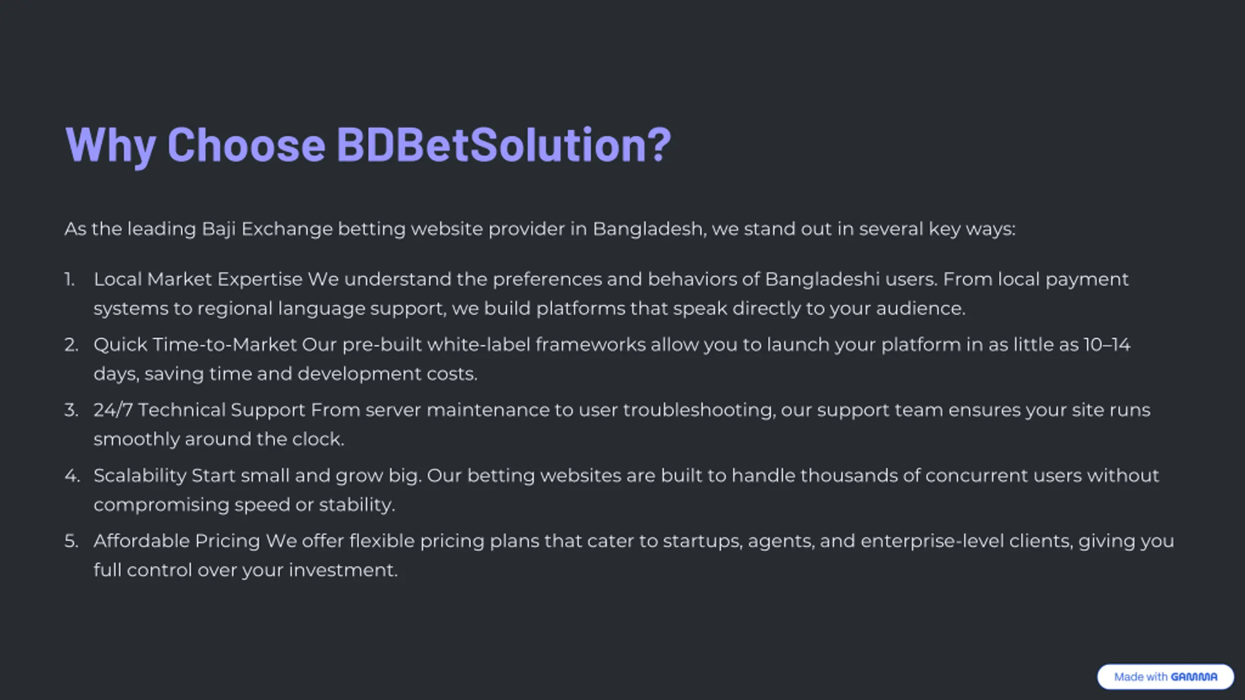 Why Choose BDBetSolution? As the leading Baji Exchange betting website provider in Bangladesh, we stand out in several key ways: 1. Local Market Expertise We understand the preferences and behaviors of Bangladeshi users. From local payment systems to regional language support, we build platforms that speak directly to your audience. 2. Quick Time-to-Market Our pre-built white-label frameworks allow you to launch your platform in as little as 10 14 days, saving time and development costs. 3. 24/7 Technical Support From server maintenance to user troubleshooting, our support team ensures your site runs smoothly around the clock. 4. Scalability Start small and grow big. Our betting websites are built to handle thousands of concurrent users without compromising speed or stability. 5. Affordable Pricing We offer flexible pricing plans that cater to startups, agents, and enterprise-level clients, giving you full control over your investment. preencoded.png