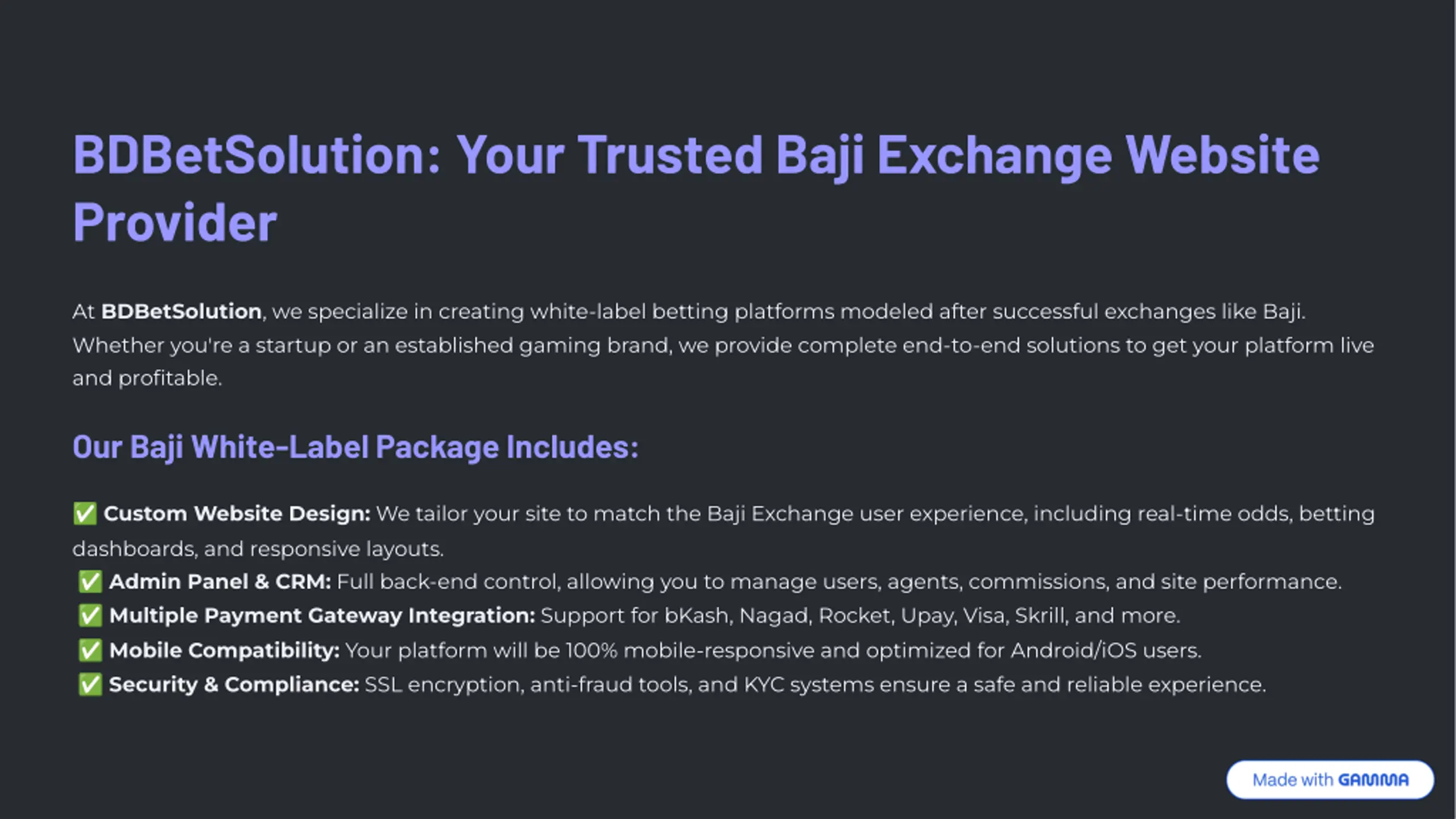 BDBetSolution: Your Trusted Baji Exchange Website Provider At BDBetSolution, we specialize in creating white-label betting platforms modeled after successful exchanges like Baji. Whether you're a startup or an established gaming brand, we provide complete end-to-end solutions to get your platform live and profitable. Our Baji White-Label Package Includes: Custom Website Design: We tailor your site to match the Baji Exchange user experience, including real-time odds, betting dashboards, and responsive layouts. ' Admin Panel & CRM: Full back-end control, allowing you to manage users, agents, commissions, and site performance. ' Multiple Payment Gateway Integration: Support for bKash, Nagad, Rocket, Upay, Visa, Skrill, and more. ' Mobile Compatibility: Your platform will be 100% mobile-responsive and optimized for Android/iOS users. ' Security & Compliance: SSL encryption, anti-fraud tools, and KYC systems ensure a safe and reliable experience. '