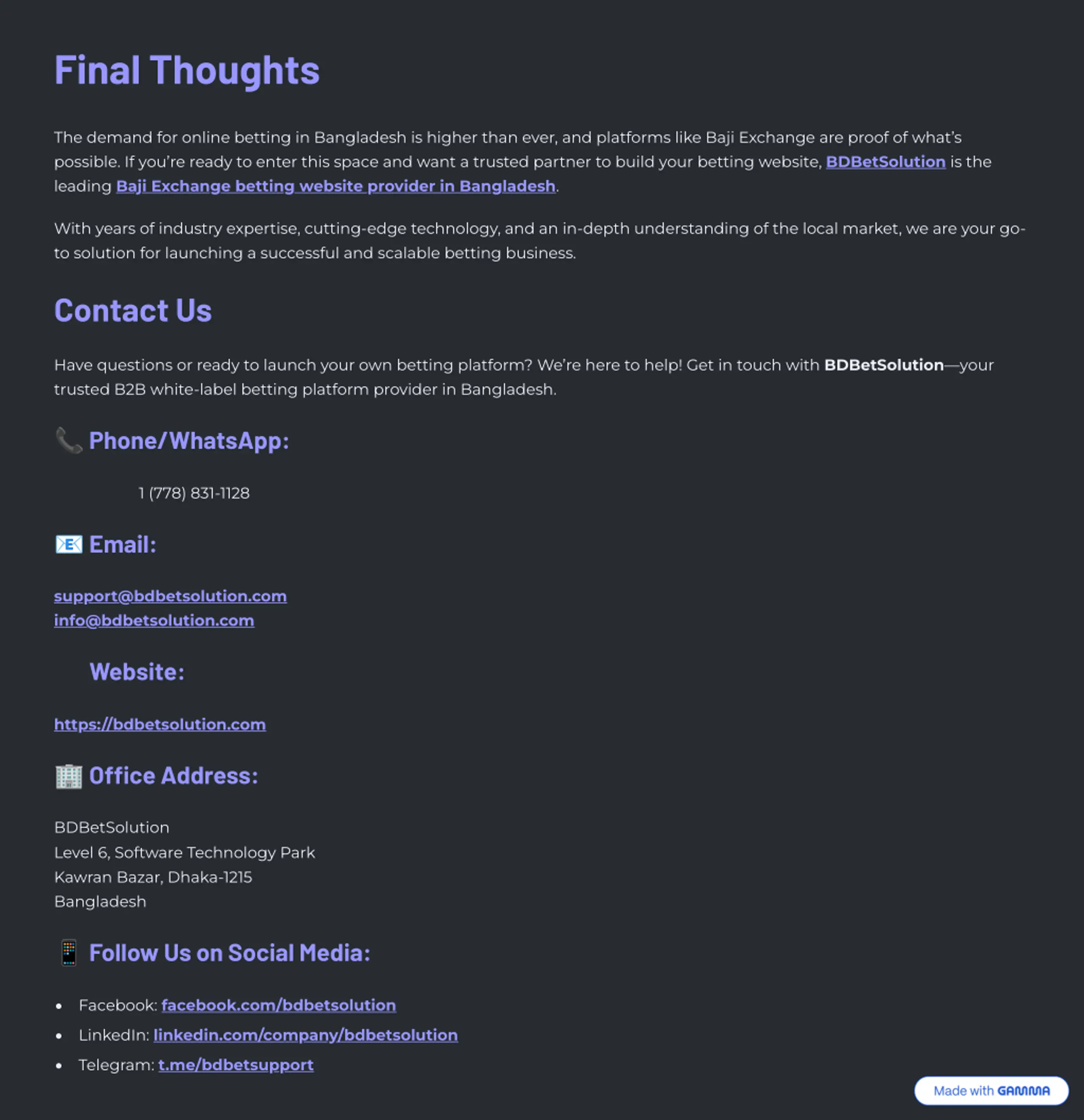 Final Thoughts The demand for online betting in Bangladesh is higher than ever, and platforms like Baji Exchange are proof of what9s possible. If you9re ready to enter this space and want a trusted partner to build your betting website, BDBetSolution is the leading Baji Exchange betting website provider in Bangladesh. With years of industry expertise, cutting-edge technology, and an in-depth understanding of the local market, we are your go- to solution for launching a successful and scalable betting business. Contact Us Have questions or ready to launch your own betting platform? We9re here to help! Get in touch with BDBetSolution4your trusted B2B white-label betting platform provider in Bangladesh. Phone/WhatsApp: ? 1 (778) 831-1128 Email: ? support@bdbetsolution.com info@bdbetsolution.com Website: https://bdbetsolution.com Office Address: ? BDBetSolution Level 6, Software Technology Park Kawran Bazar, Dhaka-1215 Bangladesh Follow Us on Social Media: ? Facebook: facebook.com/bdbetsolution LinkedIn: linkedin.com/company/bdbetsolution Telegram: t.me/bdbetsupport