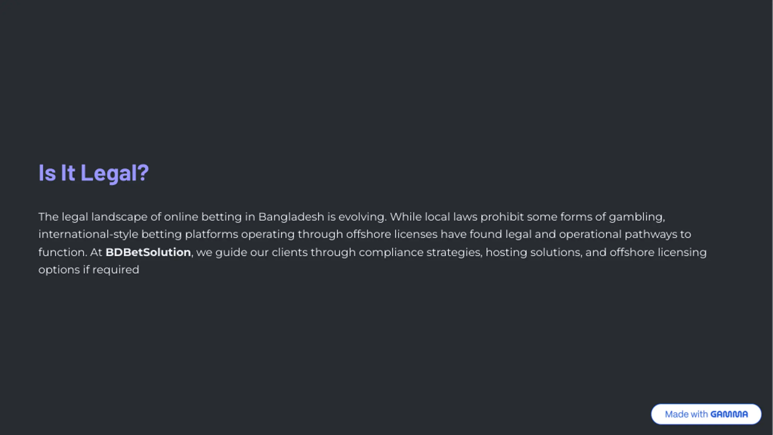 Is It Legal? The legal landscape of online betting in Bangladesh is evolving. While local laws prohibit some forms of gambling, international-style betting platforms operating through offshore licenses have found legal and operational pathways to function. At BDBetSolution, we guide our clients through compliance strategies, hosting solutions, and offshore licensing options if required