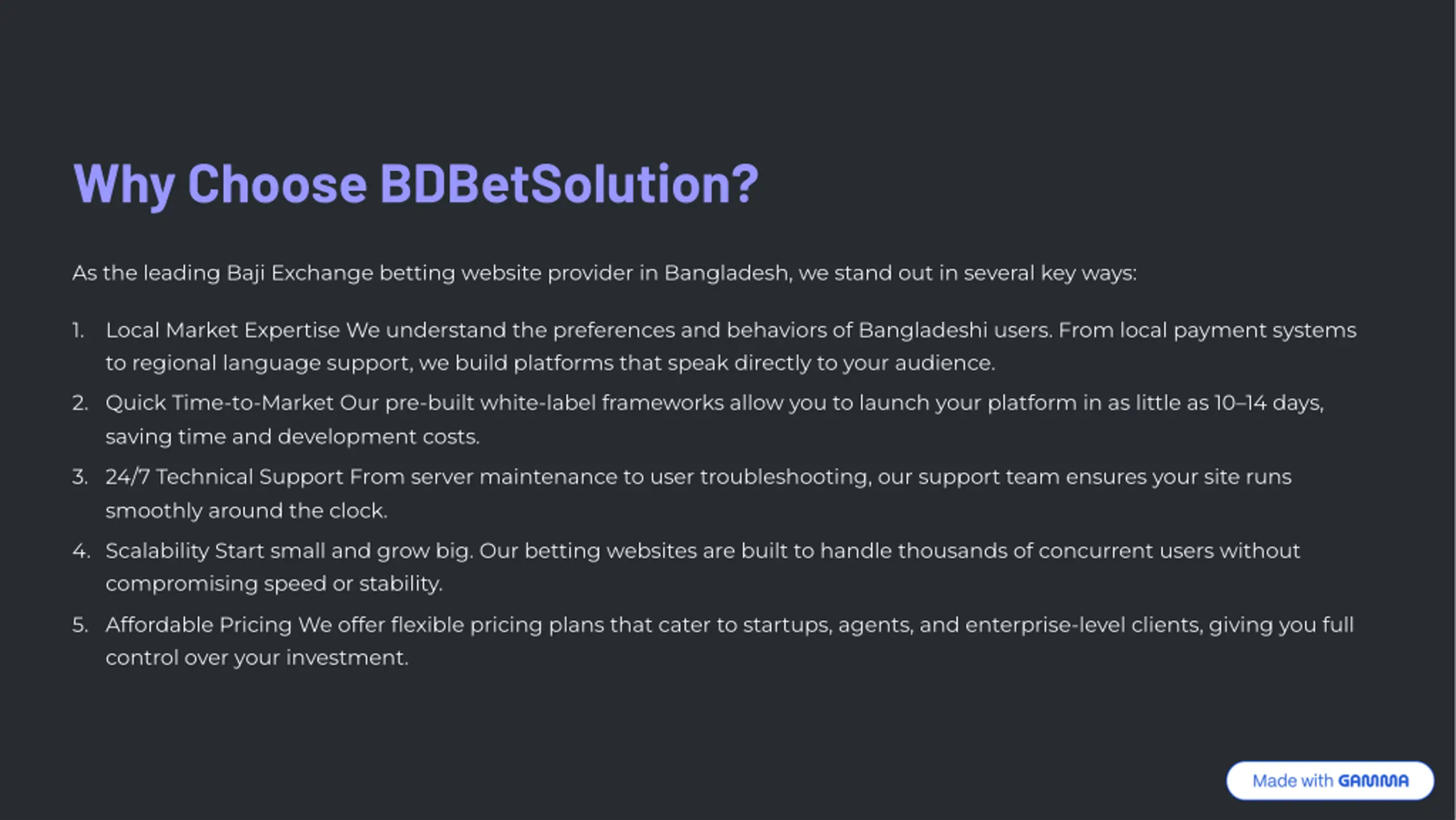 Why Choose BDBetSolution? As the leading Baji Exchange betting website provider in Bangladesh, we stand out in several key ways: 1. Local Market Expertise We understand the preferences and behaviors of Bangladeshi users. From local payment systems to regional language support, we build platforms that speak directly to your audience. 2. Quick Time-to-Market Our pre-built white-label frameworks allow you to launch your platform in as little as 10314 days, saving time and development costs. 3. 24/7 Technical Support From server maintenance to user troubleshooting, our support team ensures your site runs smoothly around the clock. 4. Scalability Start small and grow big. Our betting websites are built to handle thousands of concurrent users without compromising speed or stability. 5. Affordable Pricing We offer flexible pricing plans that cater to startups, agents, and enterprise-level clients, giving you full control over your investment.