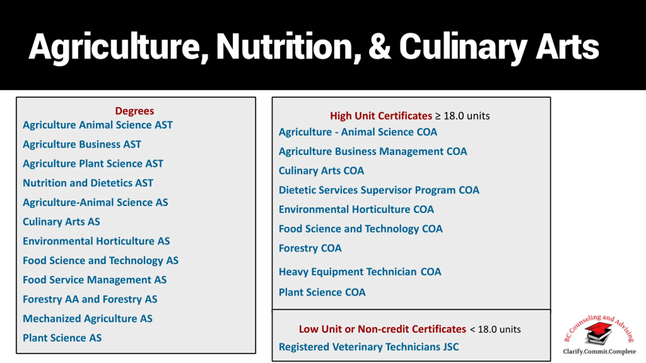 Agriculture, Nutrition, & Culinary Arts Degrees High Unit Certificates 18.0 units Agriculture - Animal Science COA Agriculture Animal Science AST Agriculture Business AST Agriculture Business Management COA Agriculture Plant Science AST Culinary Arts COA Nutrition and Dietetics AST Dietetic Services Supervisor Program COA Agriculture-Animal Science AS Environmental Horticulture COA Culinary Arts AS Food Science and Technology COA Environmental Horticulture AS Forestry COA Food Science and Technology AS Heavy Equipment TechnicianCOA Food Service Management AS Plant Science COA Forestry AA and Forestry AS Mechanized Agriculture AS Low Unit or Non-credit Certificates< 18.0 units Registered Veterinary Technicians JSC Plant Science AS