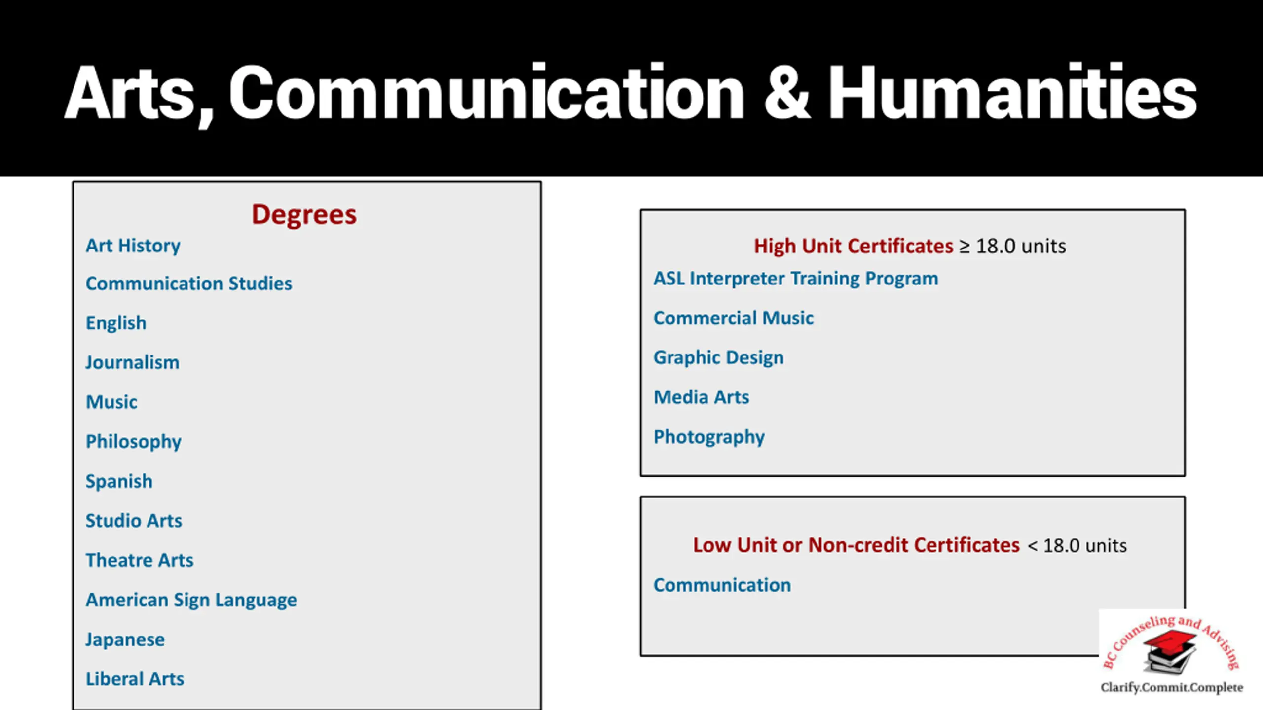 Arts, Communication & Humanities Degrees High Unit Certificates 18.0 units Art History ASL Interpreter Training Program Communication Studies Commercial Music English Graphic Design Journalism Media Arts Music Photography Philosophy Spanish Studio Arts Low Unit or Non-credit Certificates< 18.0 units Theatre Arts Communication American Sign Language Japanese Liberal Arts
