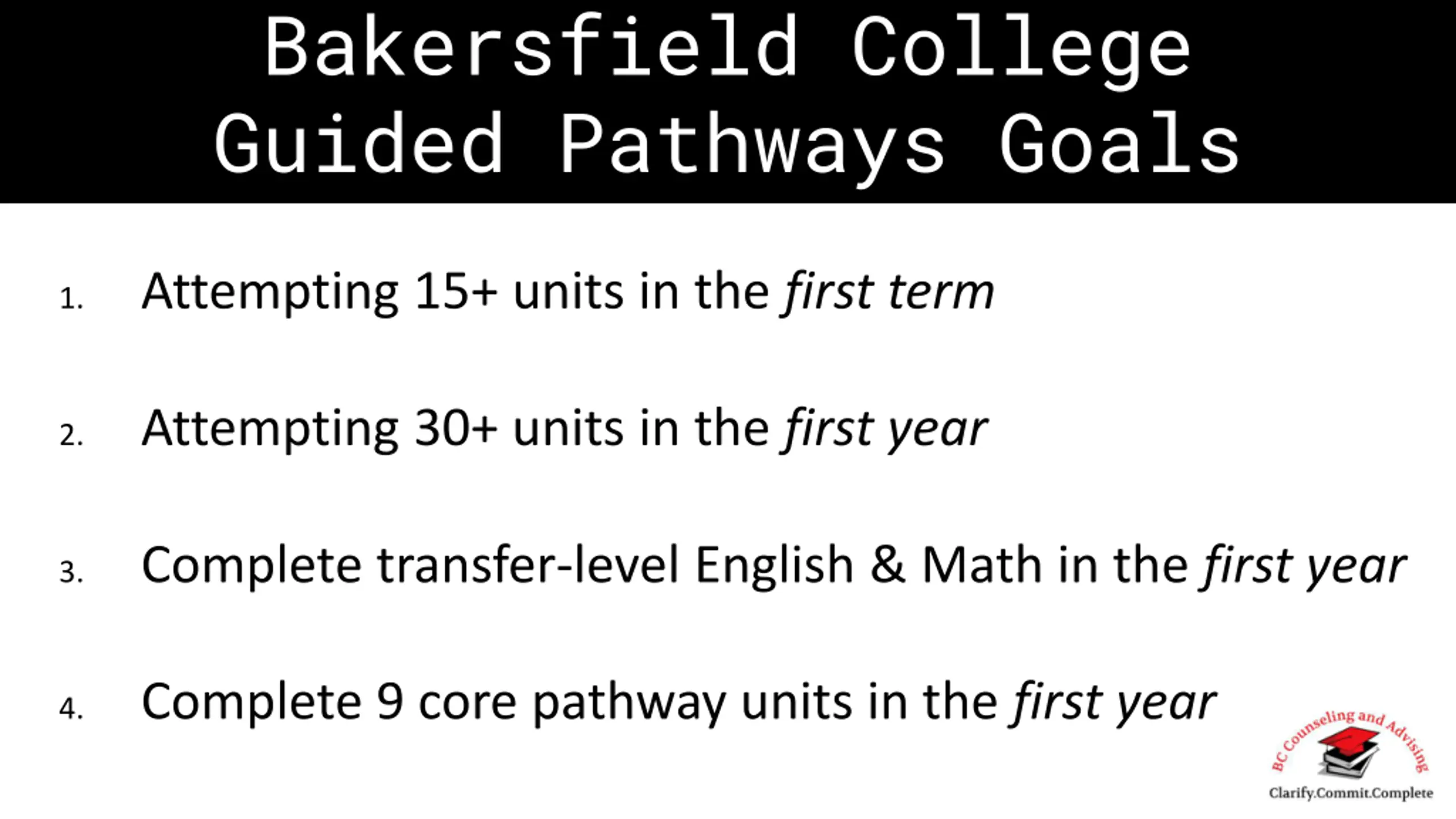Bakersfield College Guided Pathways Goals Attempting 15+ units in the first term 1. Attempting 30+ units in the first year 2. Complete transfer-level English & Math in the first year 3. Complete 9 core pathway units in the first year 4.