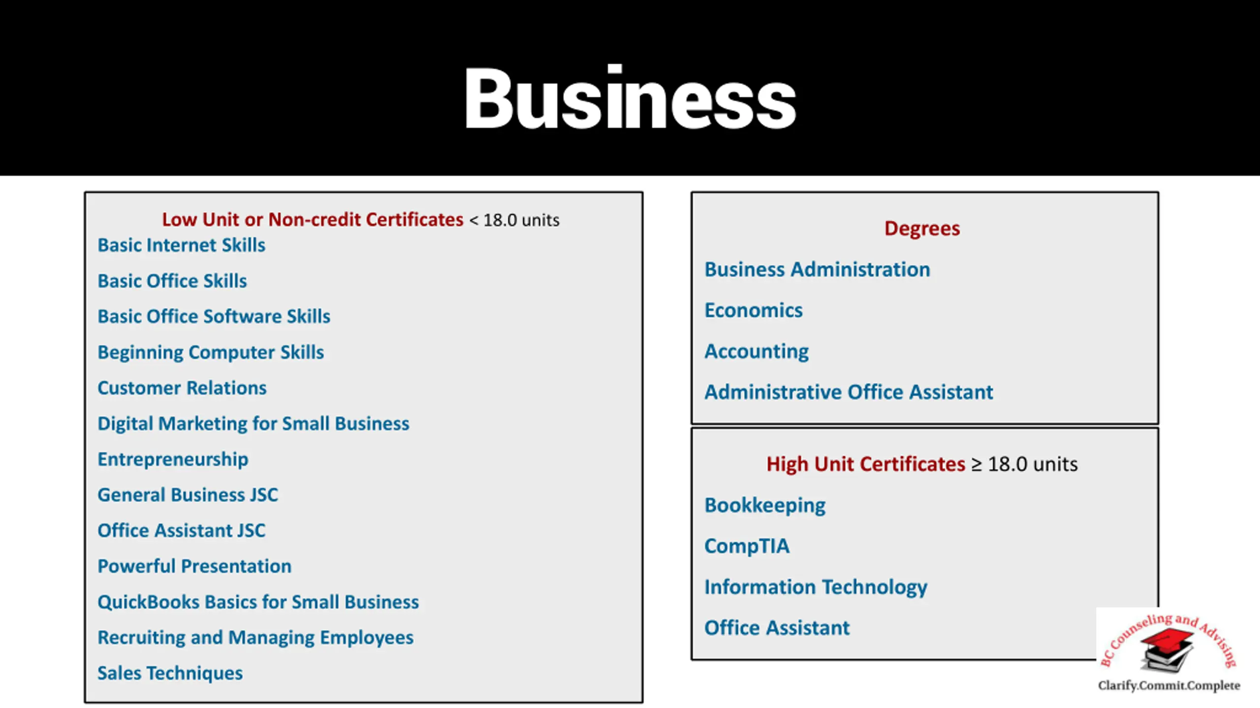 Business Low Unit or Non-credit Certificates< 18.0 units Basic Internet Skills Degrees Business Administration Basic Office Skills Economics Basic Office Software Skills Accounting Beginning Computer Skills Customer Relations Administrative Office Assistant Digital Marketing for Small Business Entrepreneurship High Unit Certificates 18.0 units General Business JSC Bookkeeping Office Assistant JSC CompTIA Powerful Presentation Information Technology QuickBooks Basics for Small Business Office Assistant Recruiting and Managing Employees Sales Techniques