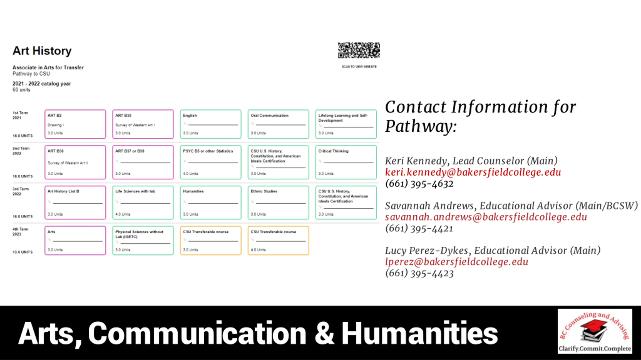 Contact Information for Pathway: Keri Kennedy, Lead Counselor (Main) keri.kennedy@bakersfieldcollege.edu (661) 395-4632 Savannah Andrews, Educational Advisor (Main/BCSW) savannah.andrews@bakersfieldcollege.edu (661) 395-4421 Lucy Perez-Dykes, Educational Advisor (Main) lperez@bakersfieldcollege.edu (661) 395-4423 Arts, Communication & Humanities
