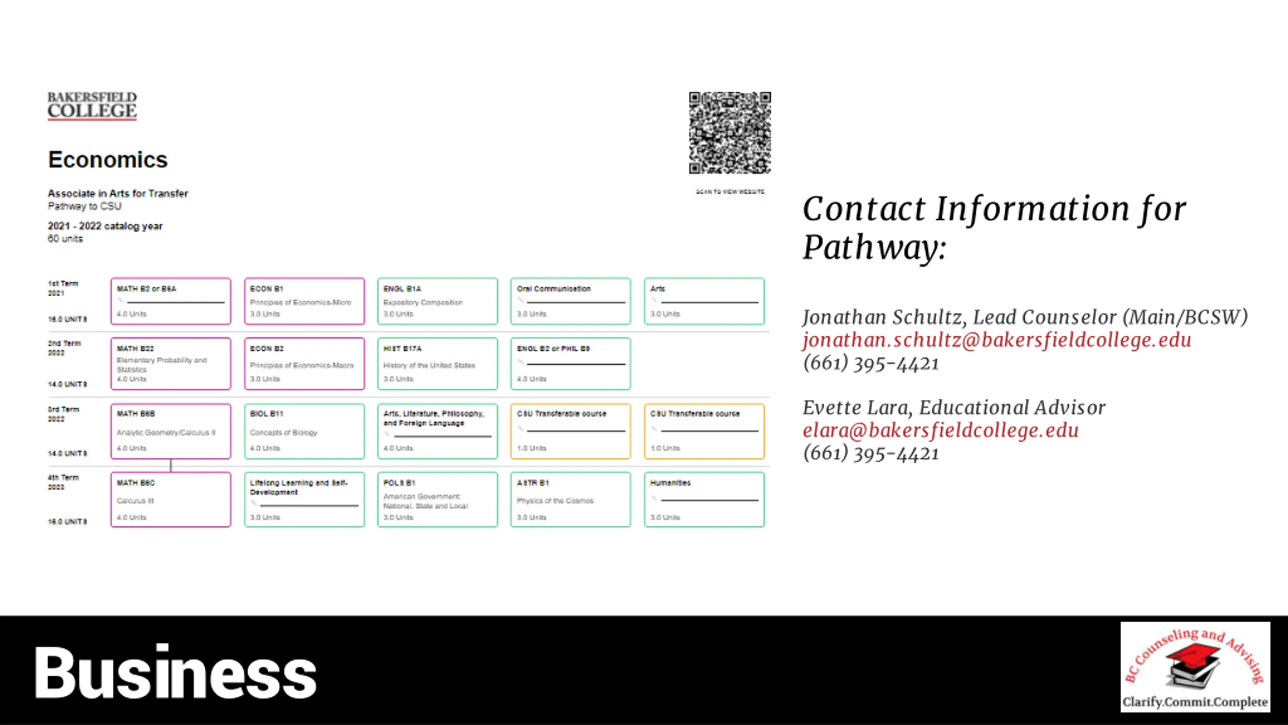 Contact Information for Pathway: Jonathan Schultz, Lead Counselor (Main/BCSW) jonathan.schultz@bakersfieldcollege.edu (661) 395-4421 Evette Lara, Educational Advisor elara@bakersfieldcollege.edu (661) 395-4421 Business