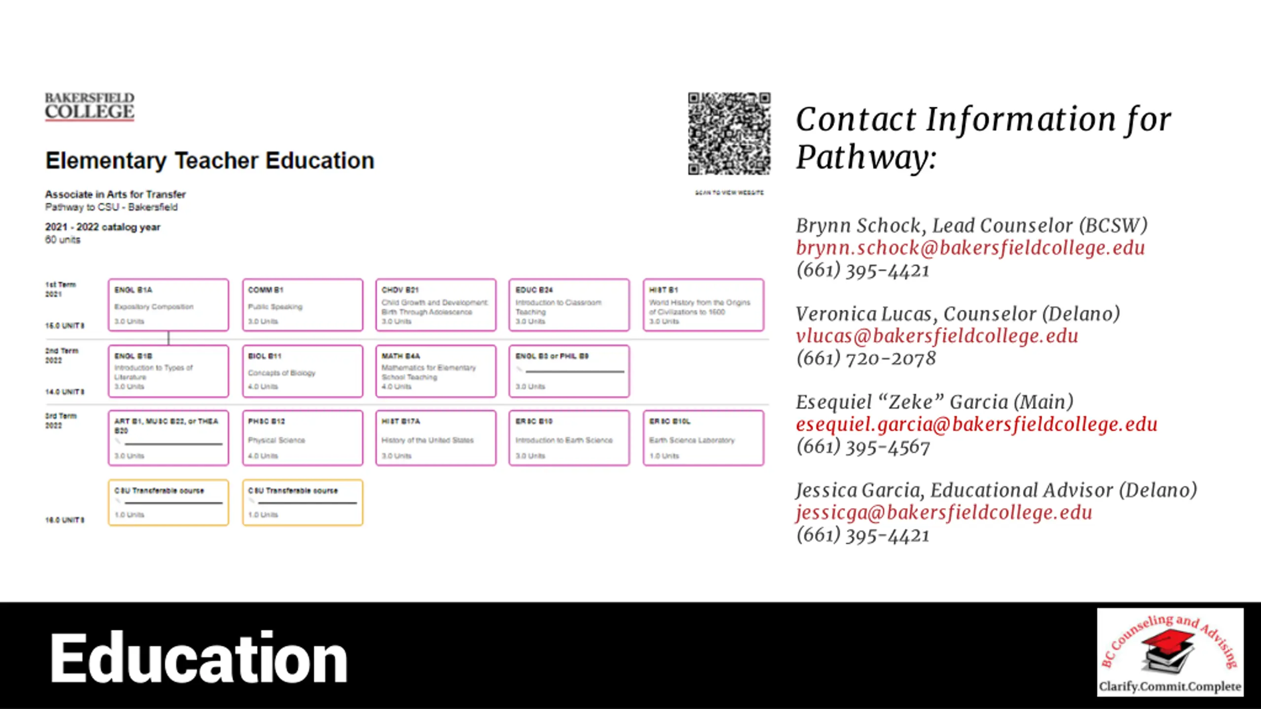 Contact Information for Pathway: Brynn Schock, Lead Counselor (BCSW) brynn.schock@bakersfieldcollege.edu (661) 395-4421 Veronica Lucas, Counselor (Delano) vlucas@bakersfieldcollege.edu (661) 720-2078 Esequiel Zeke Garcia (Main) esequiel.garcia@bakersfieldcollege.edu (661) 395-4567 Jessica Garcia, Educational Advisor (Delano) jessicga@bakersfieldcollege.edu (661) 395-4421 Education