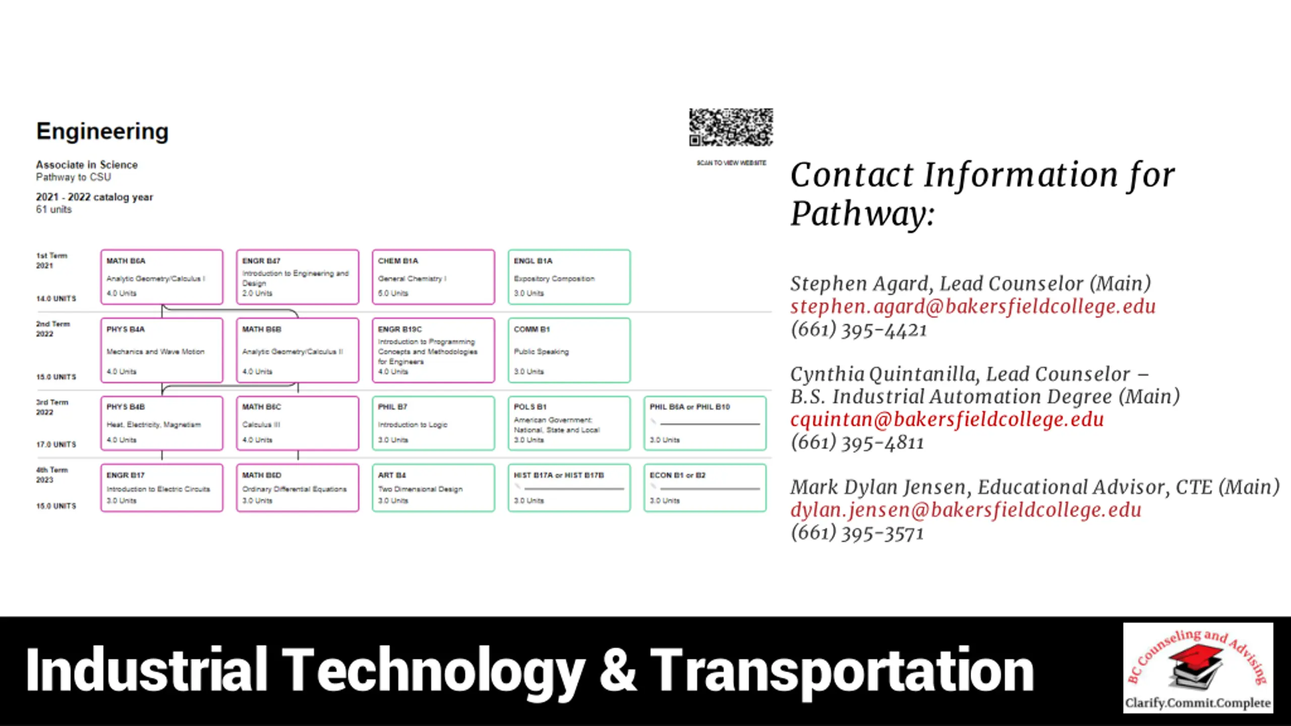Contact Information for Pathway: Stephen Agard, Lead Counselor (Main) stephen.agard@bakersfieldcollege.edu (661) 395-4421 Cynthia Quintanilla, Lead Counselor B.S. Industrial Automation Degree (Main) cquintan@bakersfieldcollege.edu (661) 395-4811 Mark Dylan Jensen, Educational Advisor, CTE (Main) dylan.jensen@bakersfieldcollege.edu (661) 395-3571 Industrial Technology & Transportation