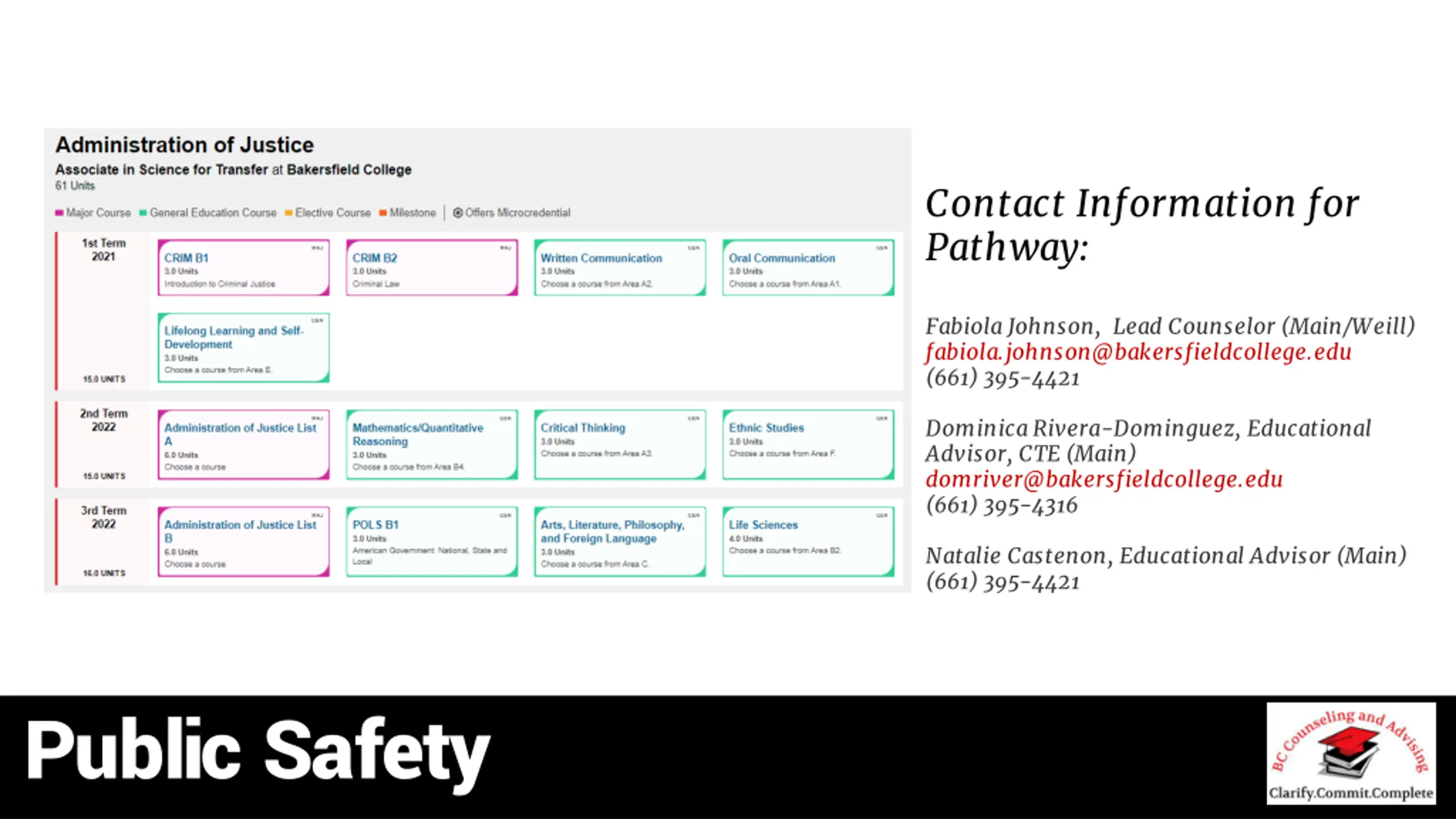 Contact Information for Pathway: Fabiola Johnson, Lead Counselor (Main/Weill) fabiola.johnson@bakersfieldcollege.edu (661) 395-4421 Dominica Rivera-Dominguez, Educational Advisor, CTE (Main) domriver@bakersfieldcollege.edu (661) 395-4316 Natalie Castenon, Educational Advisor (Main) (661) 395-4421 Public Safety