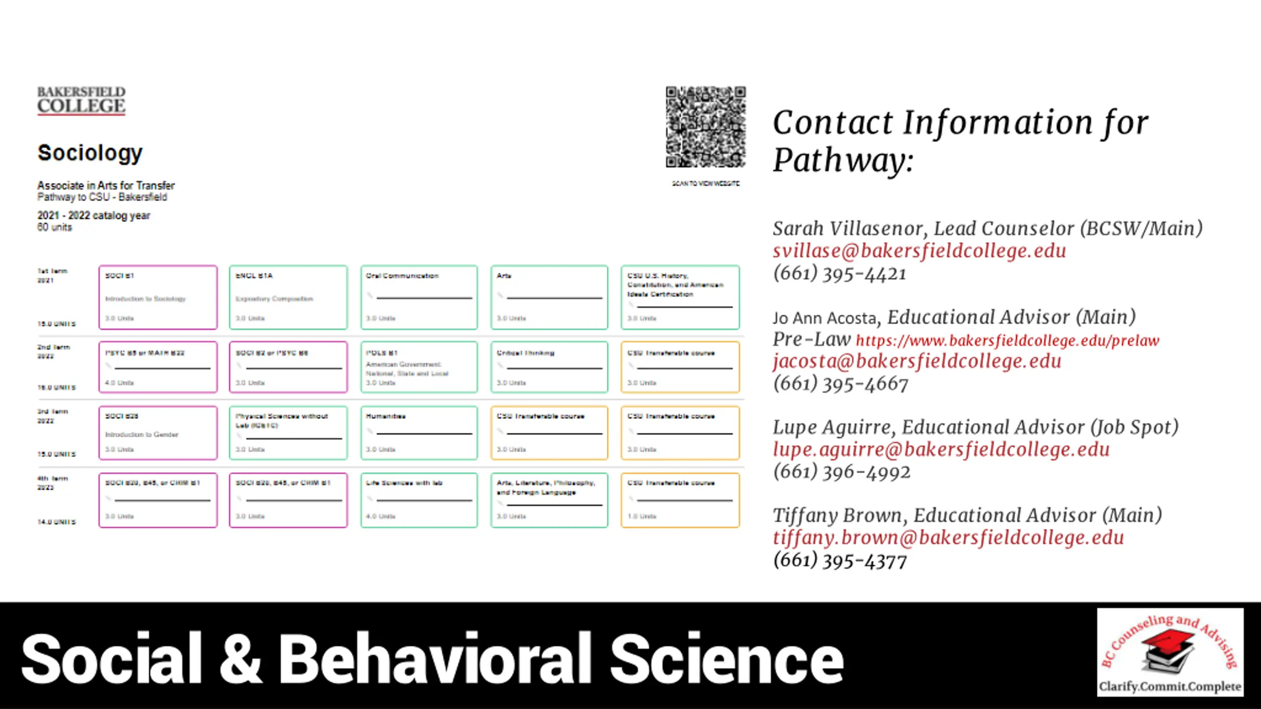 Contact Information for Pathway: Sarah Villasenor, Lead Counselor (BCSW/Main) svillase@bakersfieldcollege.edu (661) 395-4421 Jo Ann Acosta, Educational Advisor (Main) Pre-Law https://www.bakersfieldcollege.edu/prelaw jacosta@bakersfieldcollege.edu (661) 395-4667 Lupe Aguirre, Educational Advisor (Job Spot) lupe.aguirre@bakersfieldcollege.edu (661) 396-4992 Tiffany Brown, Educational Advisor (Main) tiffany.brown@bakersfieldcollege.edu (661) 395-4377 Social & Behavioral Science