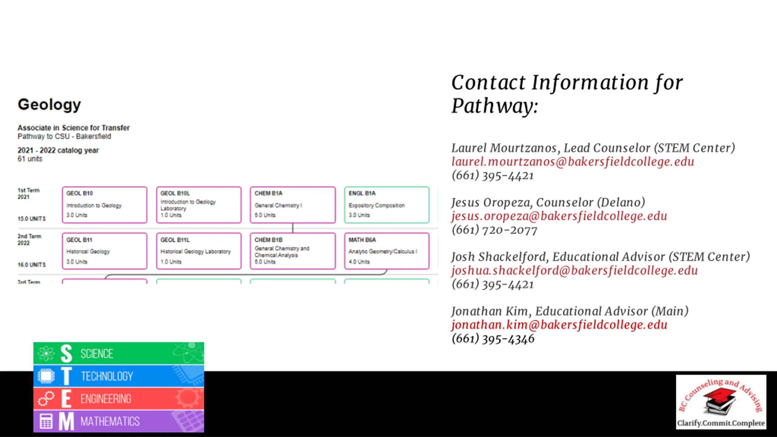 Contact Information for Pathway: Laurel Mourtzanos, Lead Counselor (STEM Center) laurel.mourtzanos@bakersfieldcollege.edu (661) 395-4421 Jesus Oropeza, Counselor (Delano) jesus.oropeza@bakersfieldcollege.edu (661) 720-2077 Josh Shackelford, Educational Advisor (STEM Center) joshua.shackelford@bakersfieldcollege.edu (661) 395-4421 Jonathan Kim, Educational Advisor (Main) jonathan.kim@bakersfieldcollege.edu (661) 395-4346