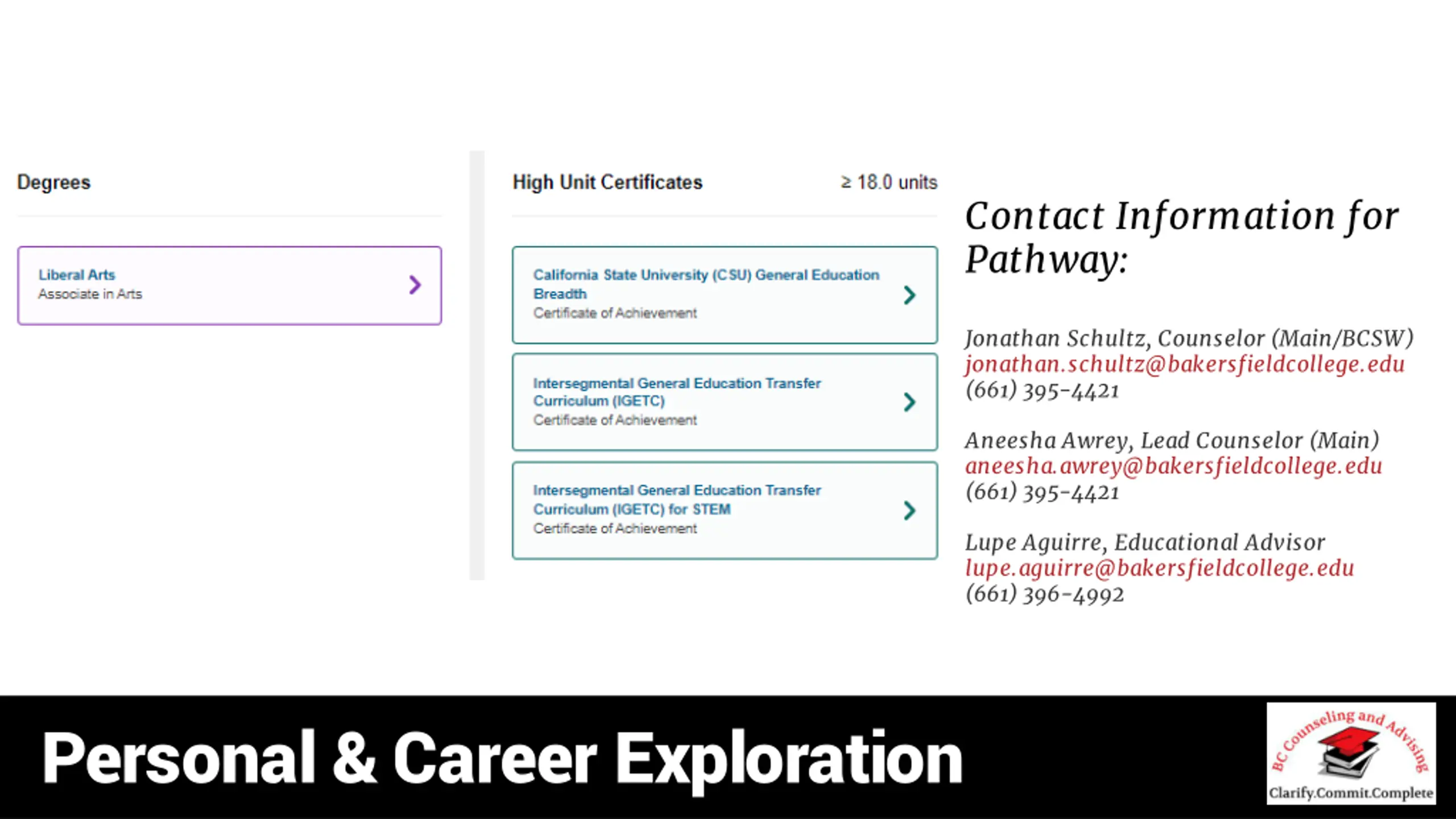 Contact Information for Pathway: Jonathan Schultz, Counselor (Main/BCSW) jonathan.schultz@bakersfieldcollege.edu (661) 395-4421 Aneesha Awrey, Lead Counselor (Main) aneesha.awrey@bakersfieldcollege.edu (661) 395-4421 Lupe Aguirre, Educational Advisor lupe.aguirre@bakersfieldcollege.edu (661) 396-4992 Personal & Career Exploration