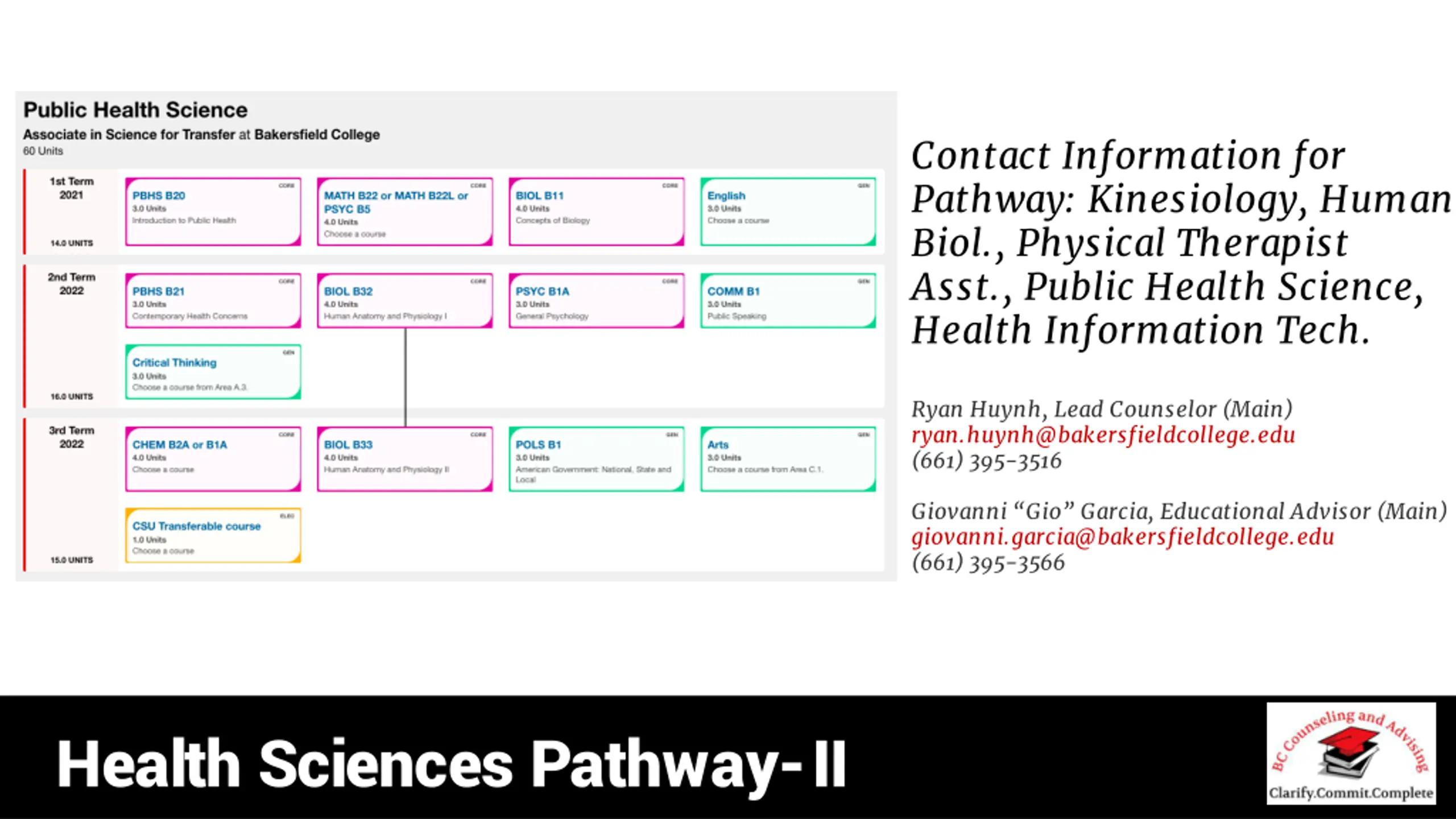 Contact Information for Pathway: Kinesiology, Human Biol., Physical Therapist Asst., Public Health Science, Health Information Tech. Ryan Huynh, Lead Counselor (Main) ryan.huynh@bakersfieldcollege.edu (661) 395-3516 Giovanni Gio Garcia, Educational Advisor (Main) giovanni.garcia@bakersfieldcollege.edu (661) 395-3566 Health Sciences Pathway- II