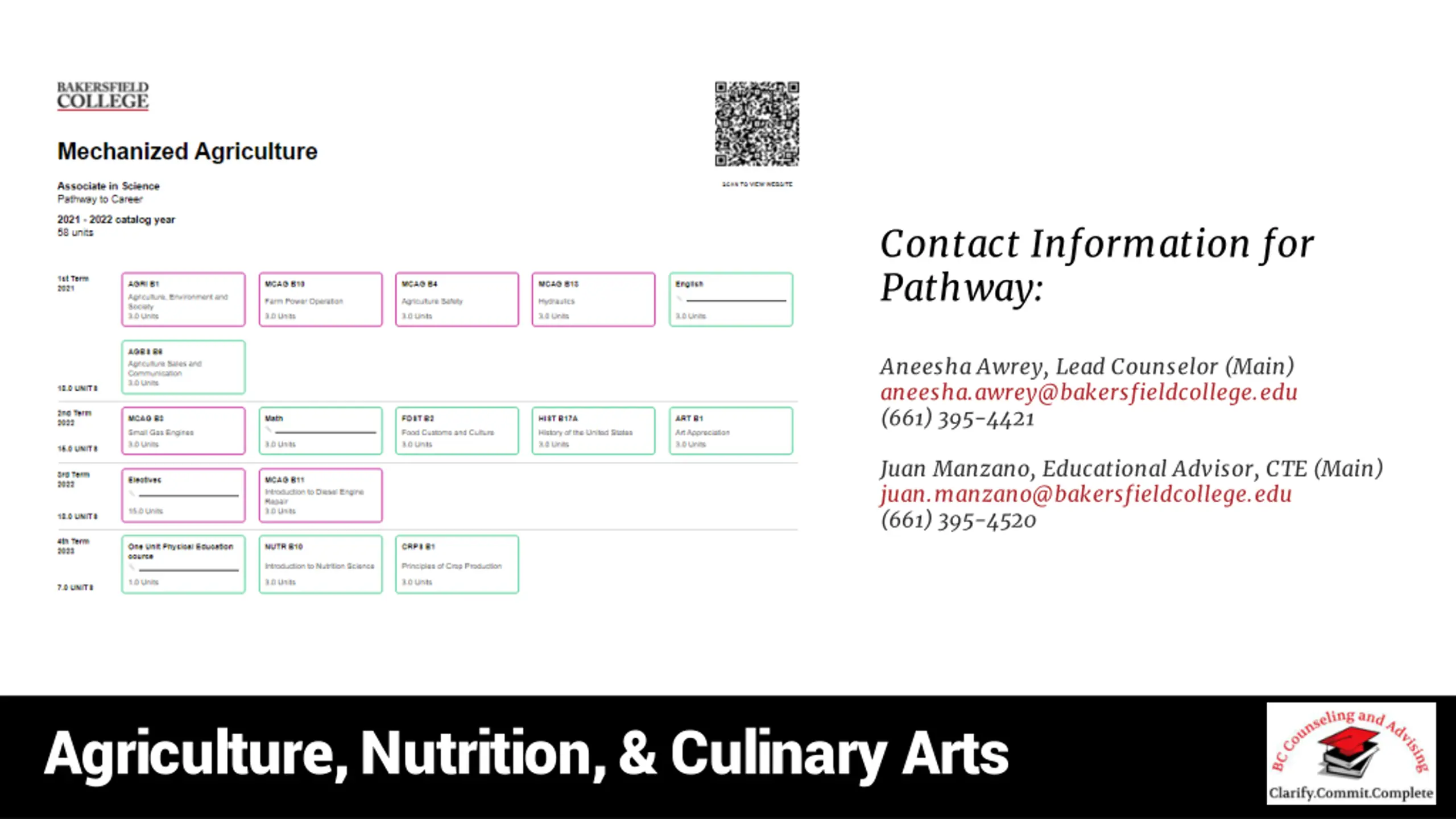 Contact Information for Pathway: Aneesha Awrey, Lead Counselor (Main) aneesha.awrey@bakersfieldcollege.edu (661) 395-4421 Juan Manzano, Educational Advisor, CTE (Main) juan.manzano@bakersfieldcollege.edu (661) 395-4520 Agriculture, Nutrition, & Culinary Arts