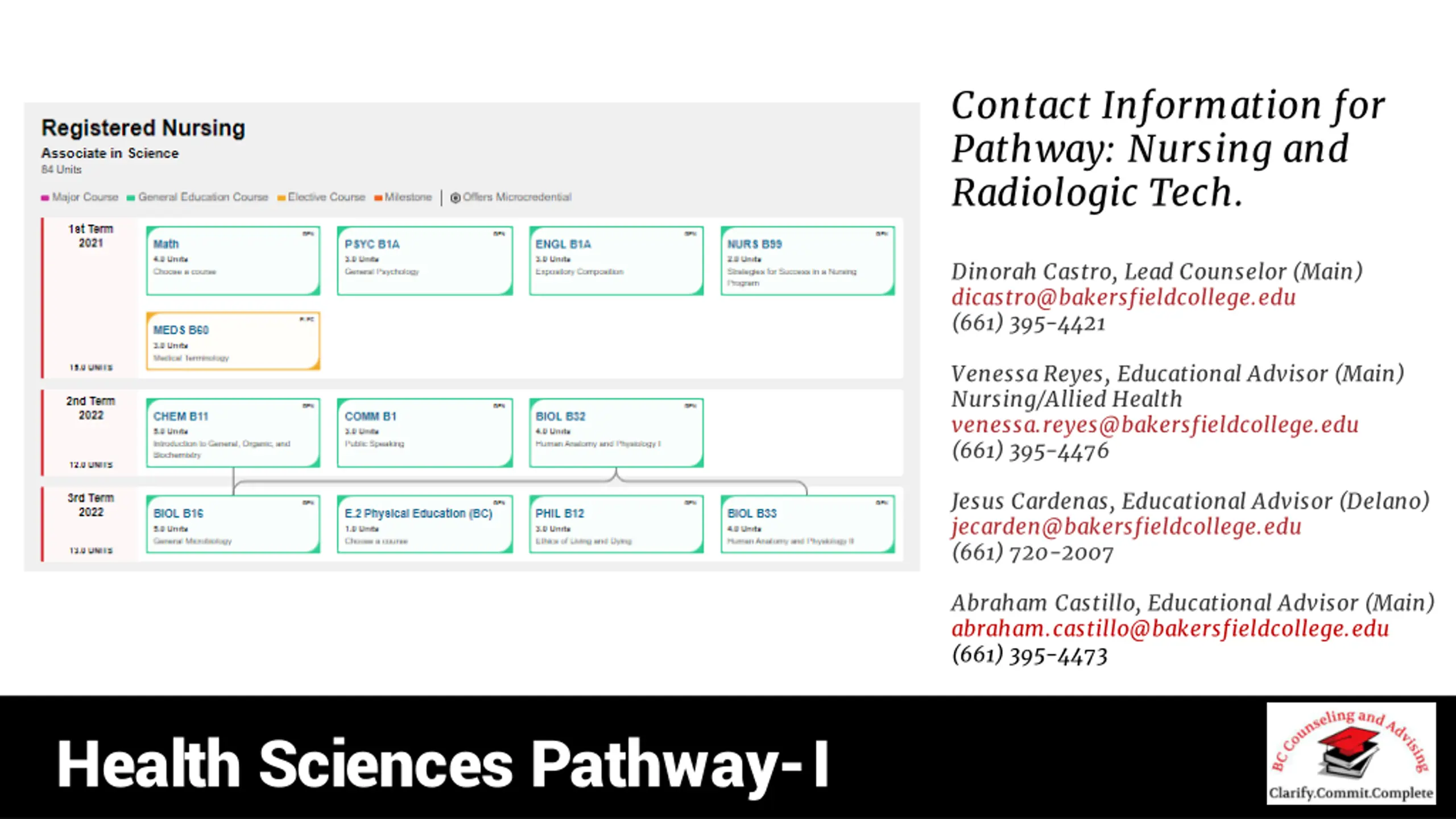 Contact Information for Pathway: Nursing and Radiologic Tech. Dinorah Castro, Lead Counselor (Main) dicastro@bakersfieldcollege.edu (661) 395-4421 Venessa Reyes, Educational Advisor (Main) Nursing/Allied Health venessa.reyes@bakersfieldcollege.edu (661) 395-4476 Jesus Cardenas, Educational Advisor (Delano) jecarden@bakersfieldcollege.edu (661) 720-2007 Abraham Castillo, Educational Advisor (Main) abraham.castillo@bakersfieldcollege.edu (661) 395-4473 Health Sciences Pathway- I