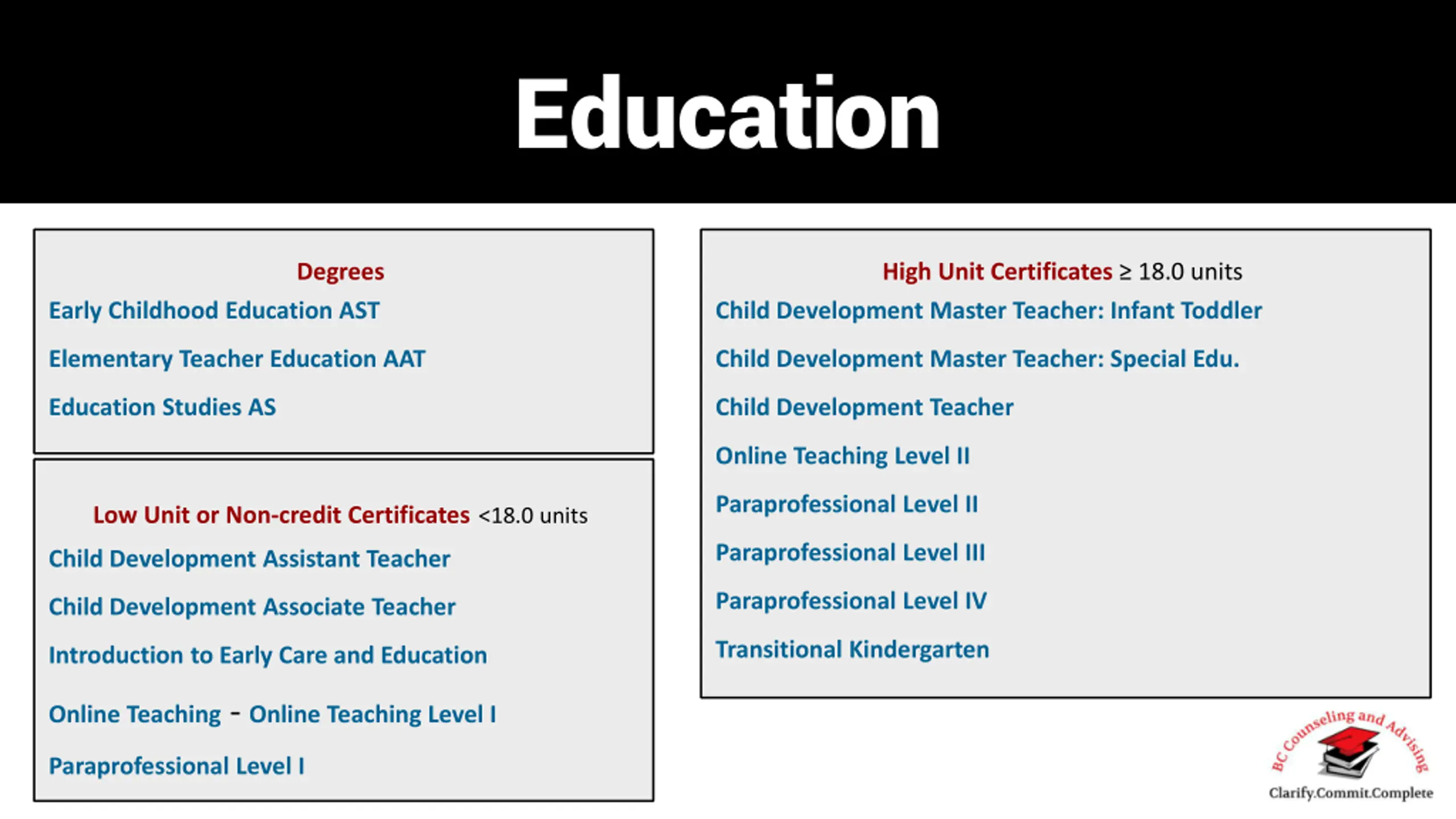 Education Degrees High Unit Certificates 18.0 units Child Development Master Teacher: Infant Toddler Early Childhood Education AST Elementary Teacher Education AAT Child Development Master Teacher: Special Edu. Education Studies AS Child Development Teacher Online Teaching Level II Paraprofessional Level II Low Unit or Non-credit Certificates<18.0 units Paraprofessional Level III Child Development Assistant Teacher Paraprofessional Level IV Child Development Associate Teacher Transitional Kindergarten Introduction to Early Care and Education Online Teaching - Online Teaching Level I Paraprofessional Level I