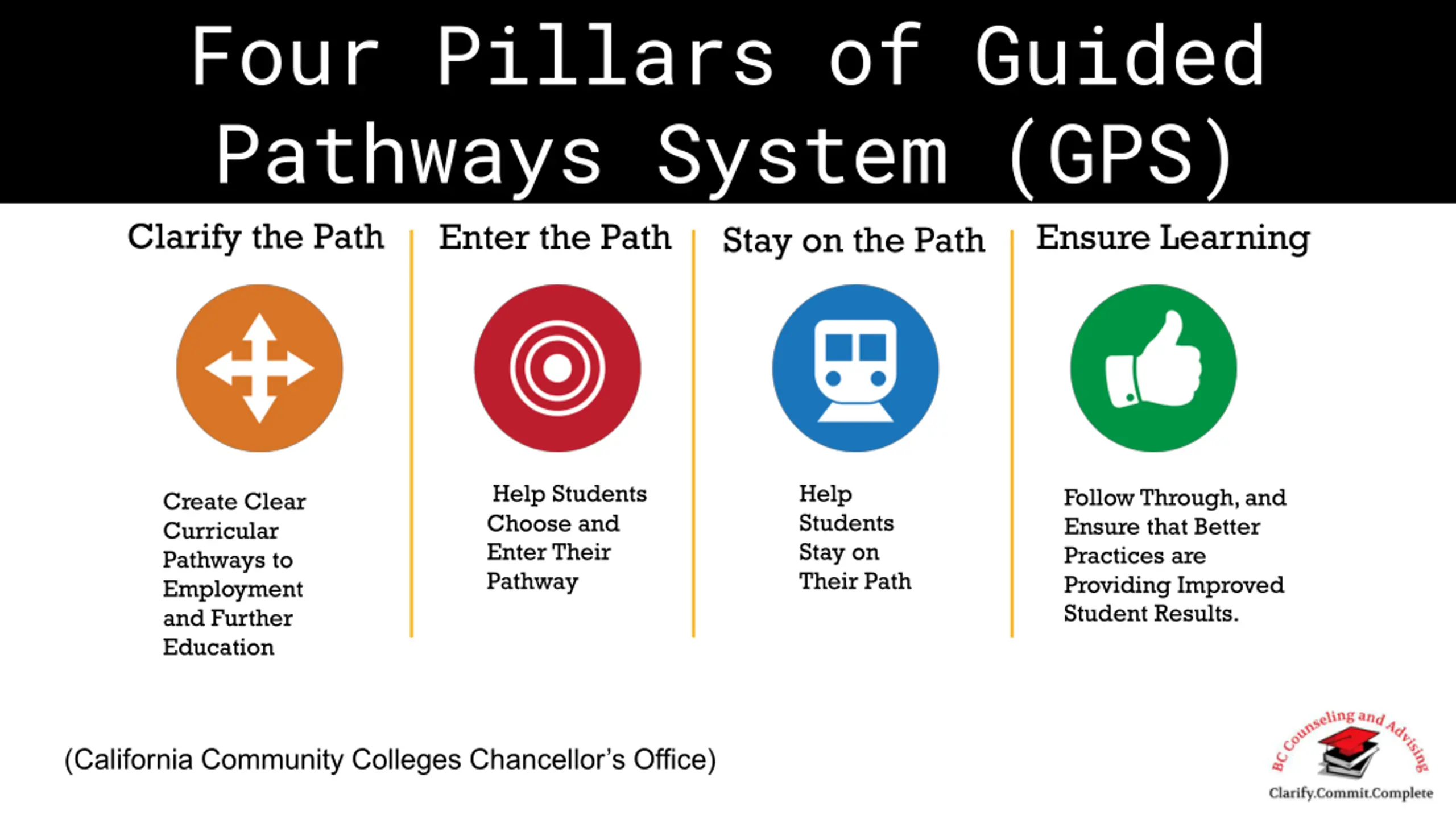 Four Pillars of Guided Pathways System (GPS) Clarify the Path Enter the Path Ensure Learning Stay on the Path Help Students Choose and Enter Their Pathway Help Students Stay on Their Path Follow Through, and Ensure that Better Practices are Providing Improved Student Results. Create Clear Curricular Pathways to Employment and Further Education (California Community Colleges Chancellor s Office)