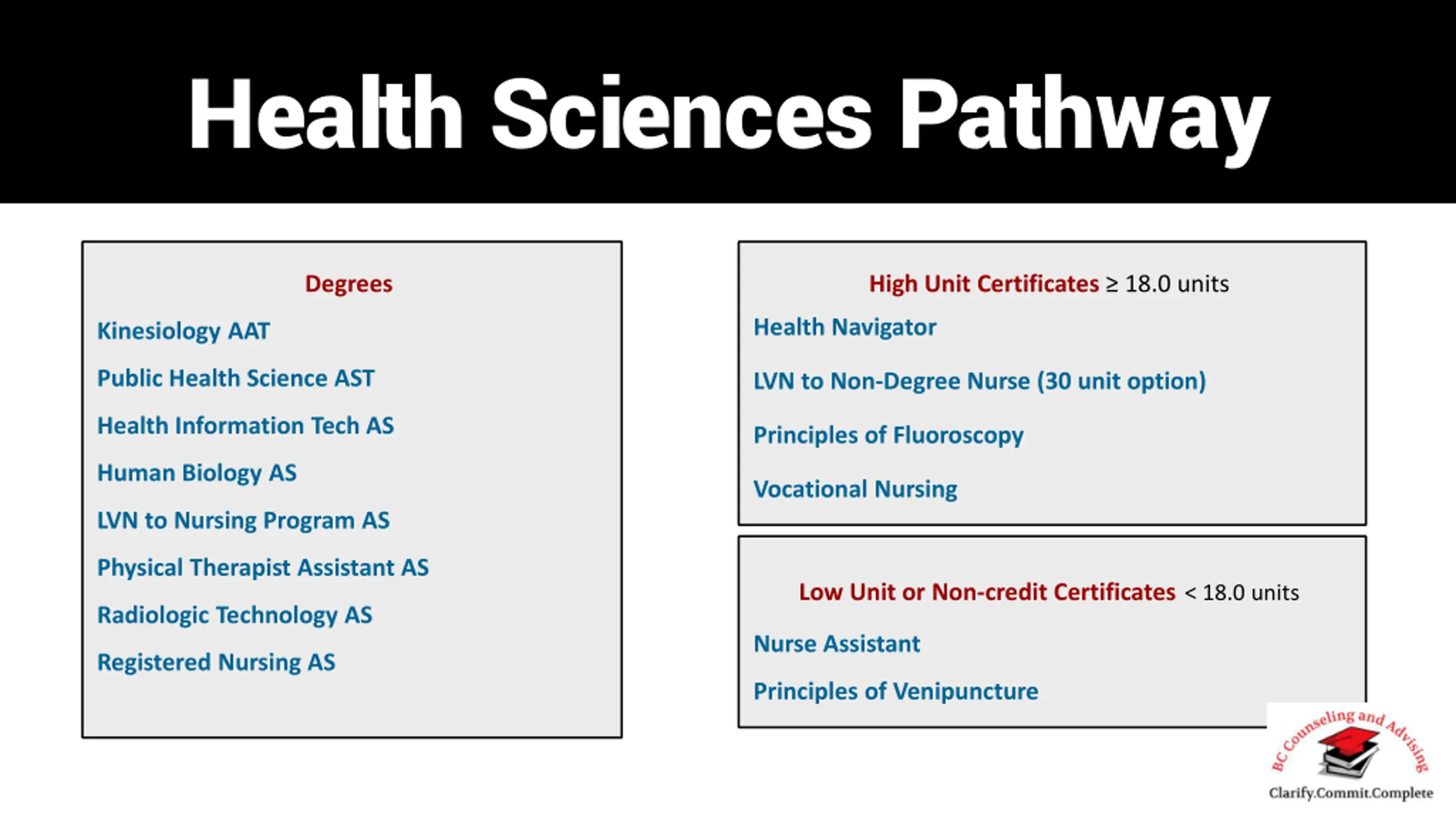 Health Sciences Pathway Degrees High Unit Certificates 18.0 units Health Navigator Kinesiology AAT Public Health Science AST LVN to Non-Degree Nurse (30 unit option) Health Information Tech AS Principles of Fluoroscopy Human Biology AS Vocational Nursing LVN to Nursing Program AS Physical Therapist Assistant AS Low Unit or Non-credit Certificates< 18.0 units Radiologic Technology AS Nurse Assistant Registered Nursing AS Principles of Venipuncture