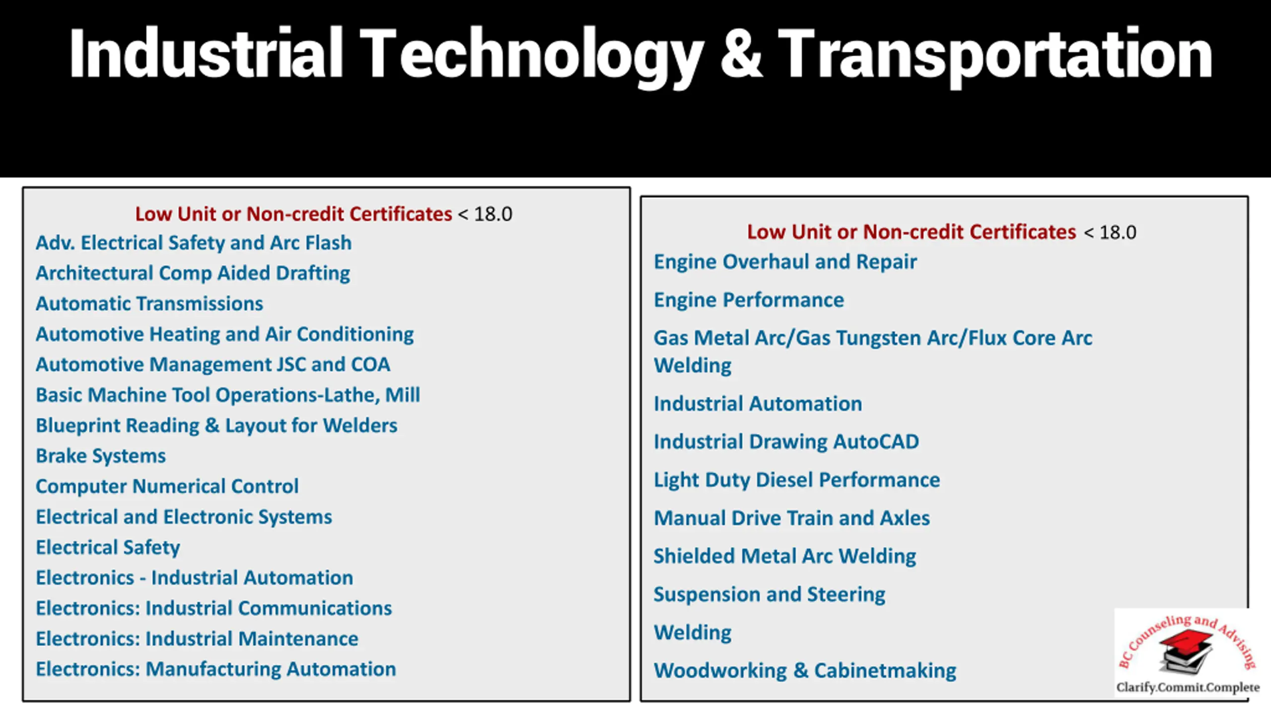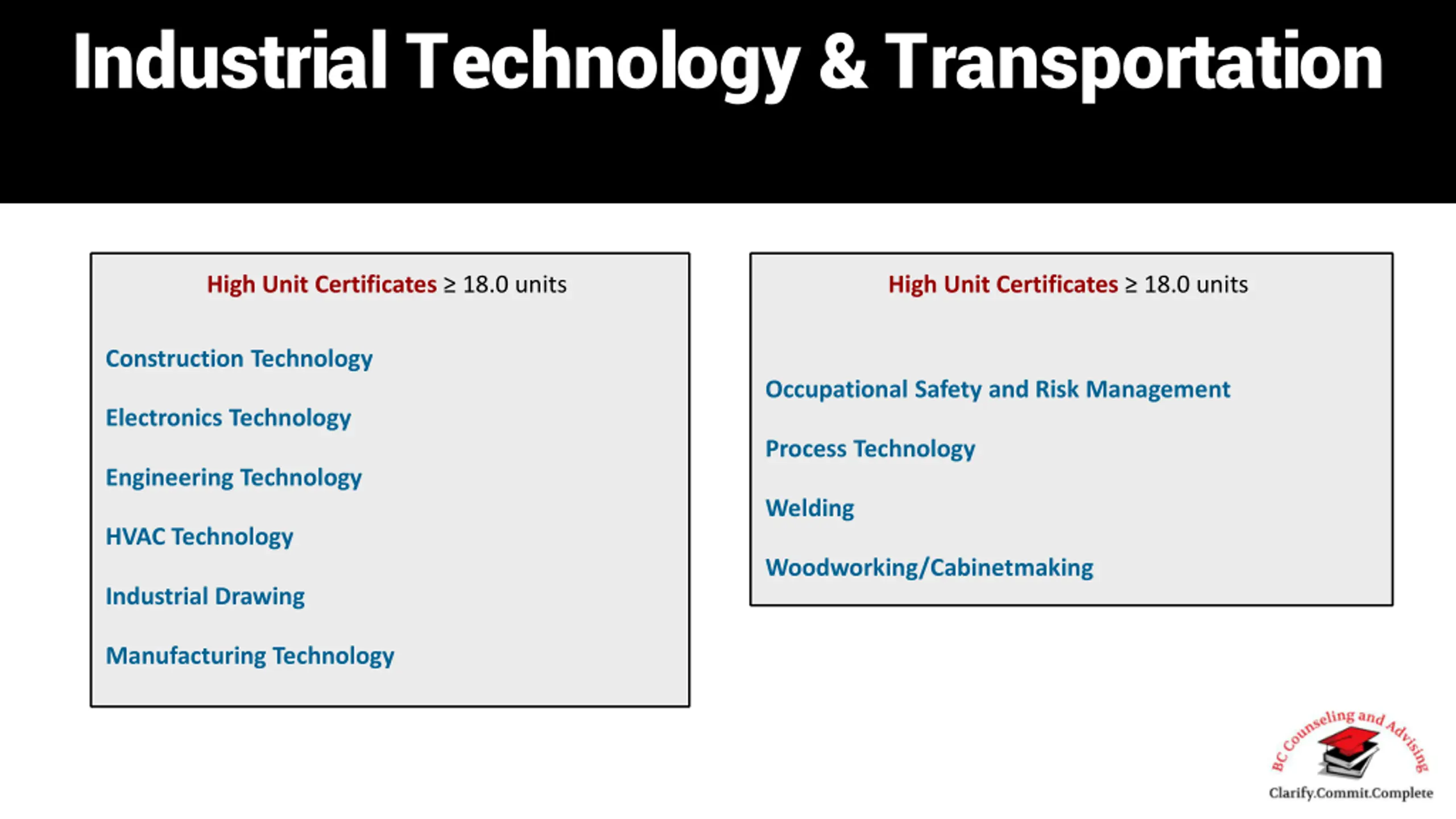 Industrial Technology & Transportation High Unit Certificates 18.0 units High Unit Certificates 18.0 units Construction Technology Occupational Safety and Risk Management Electronics Technology Process Technology Engineering Technology Welding HVAC Technology Woodworking/Cabinetmaking Industrial Drawing Manufacturing Technology