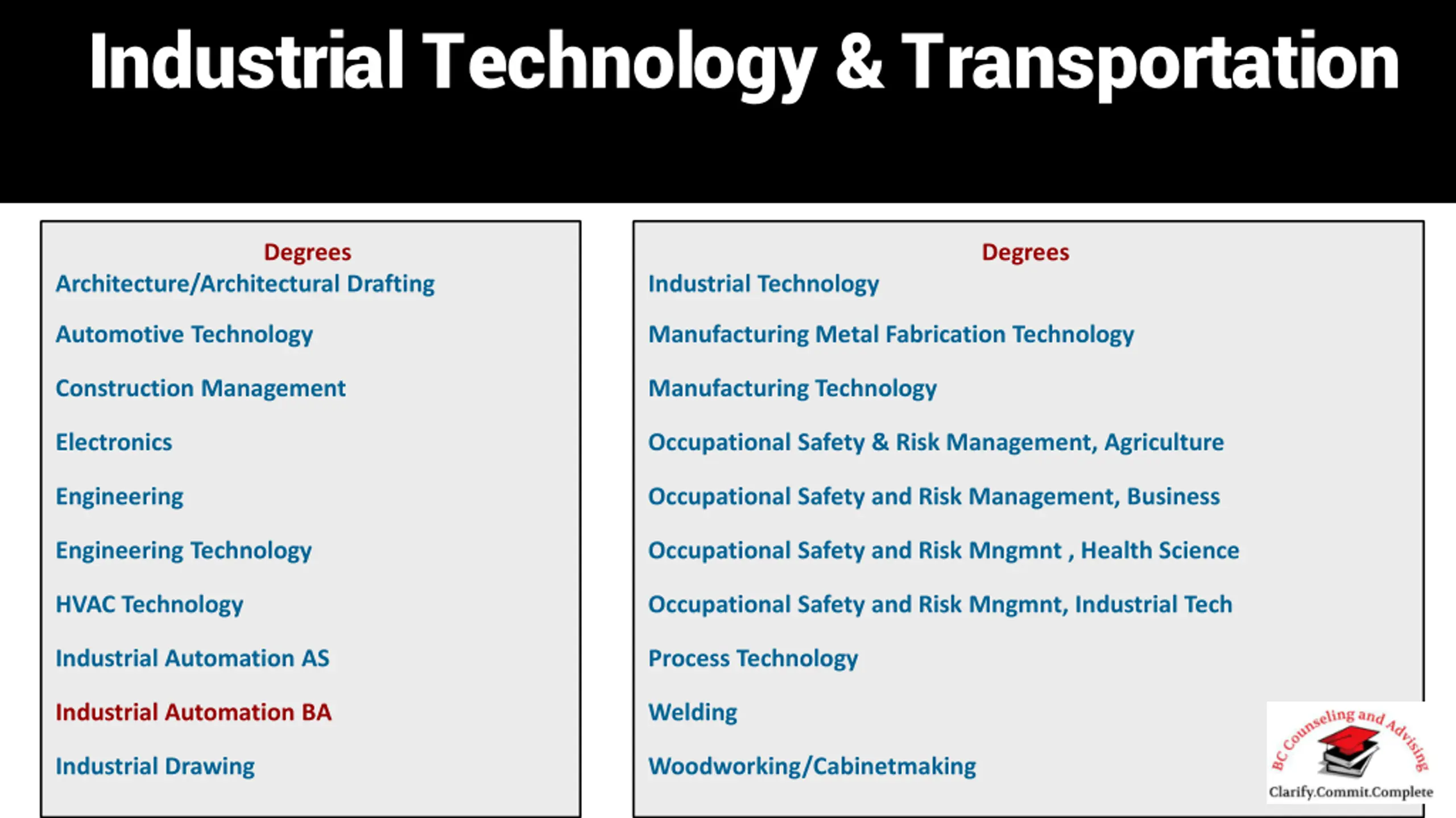 Industrial Technology & Transportation Degrees Degrees Architecture/Architectural Drafting Industrial Technology Automotive Technology Manufacturing Metal Fabrication Technology Construction Management Manufacturing Technology Electronics Occupational Safety & Risk Management, Agriculture Engineering Occupational Safety and Risk Management, Business Engineering Technology Occupational Safety and Risk Mngmnt , Health Science HVAC Technology Occupational Safety and Risk Mngmnt, Industrial Tech Industrial Automation AS Process Technology Industrial Automation BA Welding Industrial Drawing Woodworking/Cabinetmaking