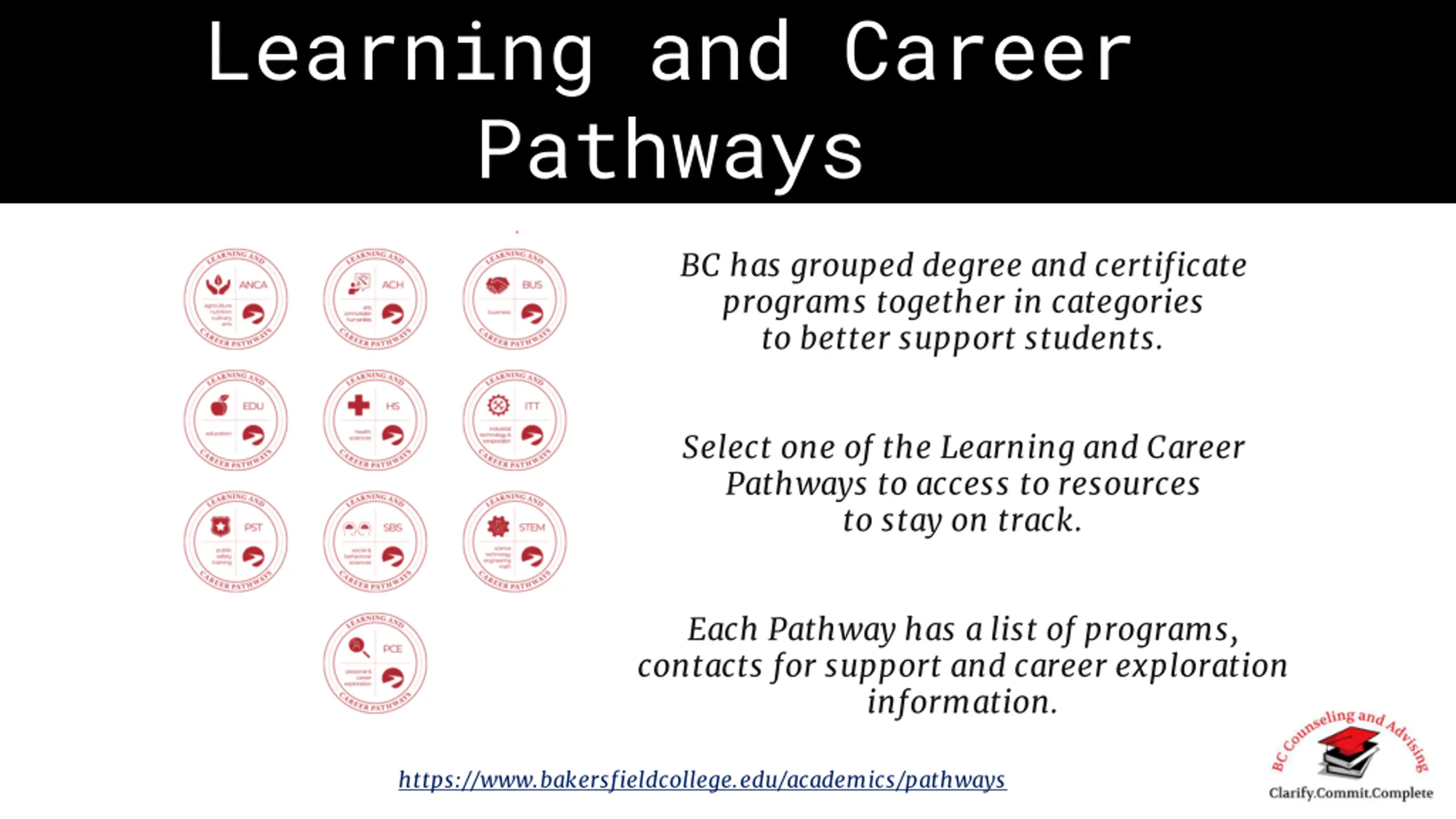 Learning and Career Pathways BC has grouped degree and certificate programs together in categories to better support students. Select one of the Learning and Career Pathways to access to resources to stay on track. Each Pathway has a list of programs, contacts for support and career exploration information. https://www.bakersfieldcollege.edu/academics/pathways