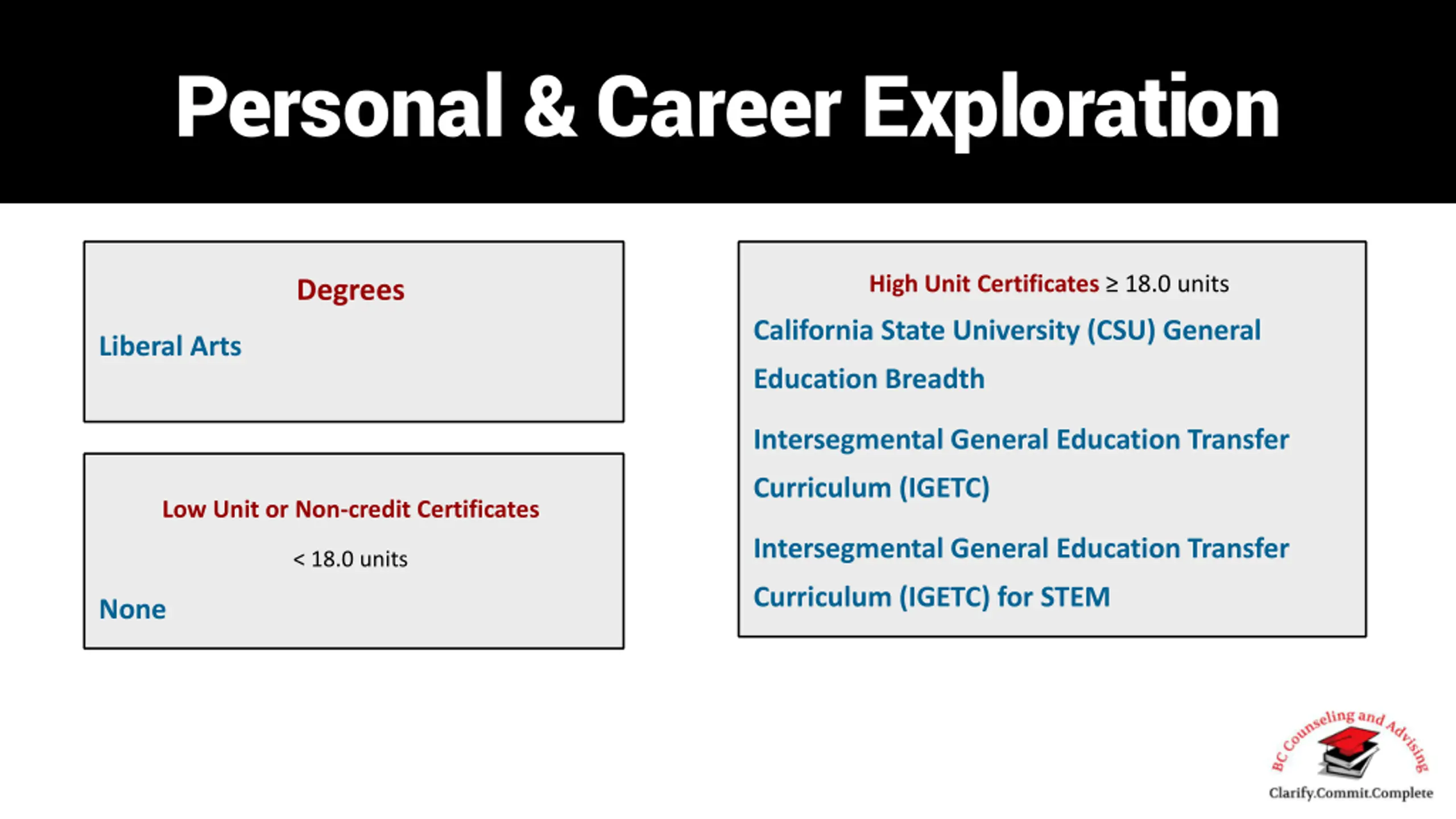 Personal & Career Exploration High Unit Certificates 18.0 units Degrees California State University (CSU) General Liberal Arts Education Breadth Intersegmental General Education Transfer Curriculum (IGETC) Low Unit or Non-credit Certificates Intersegmental General Education Transfer < 18.0 units Curriculum (IGETC) for STEM None