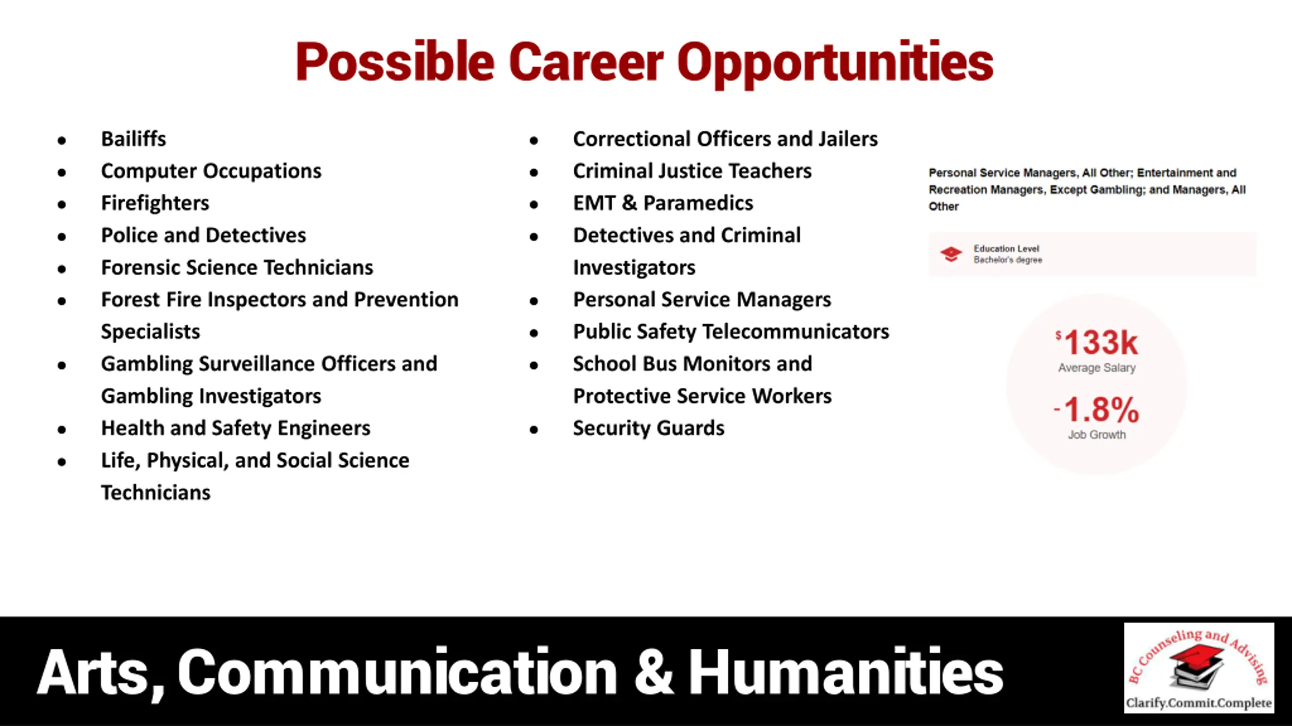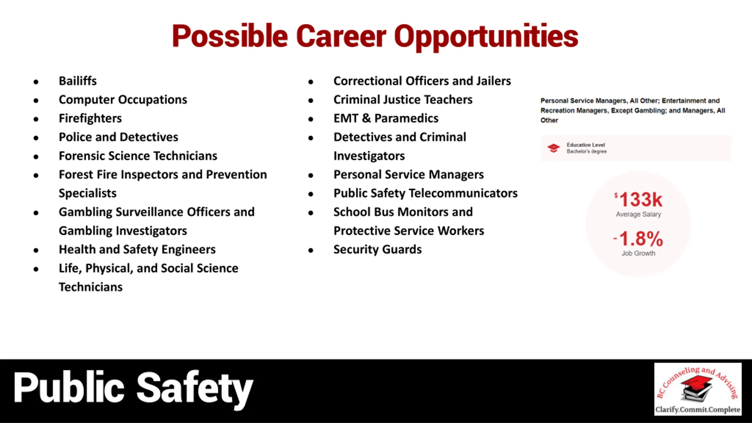 Possible Career Opportunities Bailiffs Computer Occupations Firefighters Police and Detectives Forensic Science Technicians Forest Fire Inspectors and Prevention Specialists Gambling Surveillance Officers and Gambling Investigators Health and Safety Engineers Life, Physical, and Social Science Technicians Correctional Officers and Jailers Criminal Justice Teachers EMT & Paramedics Detectives and Criminal Investigators Personal Service Managers Public Safety Telecommunicators School Bus Monitors and Protective Service Workers Security Guards Arts, Communication & Humanities