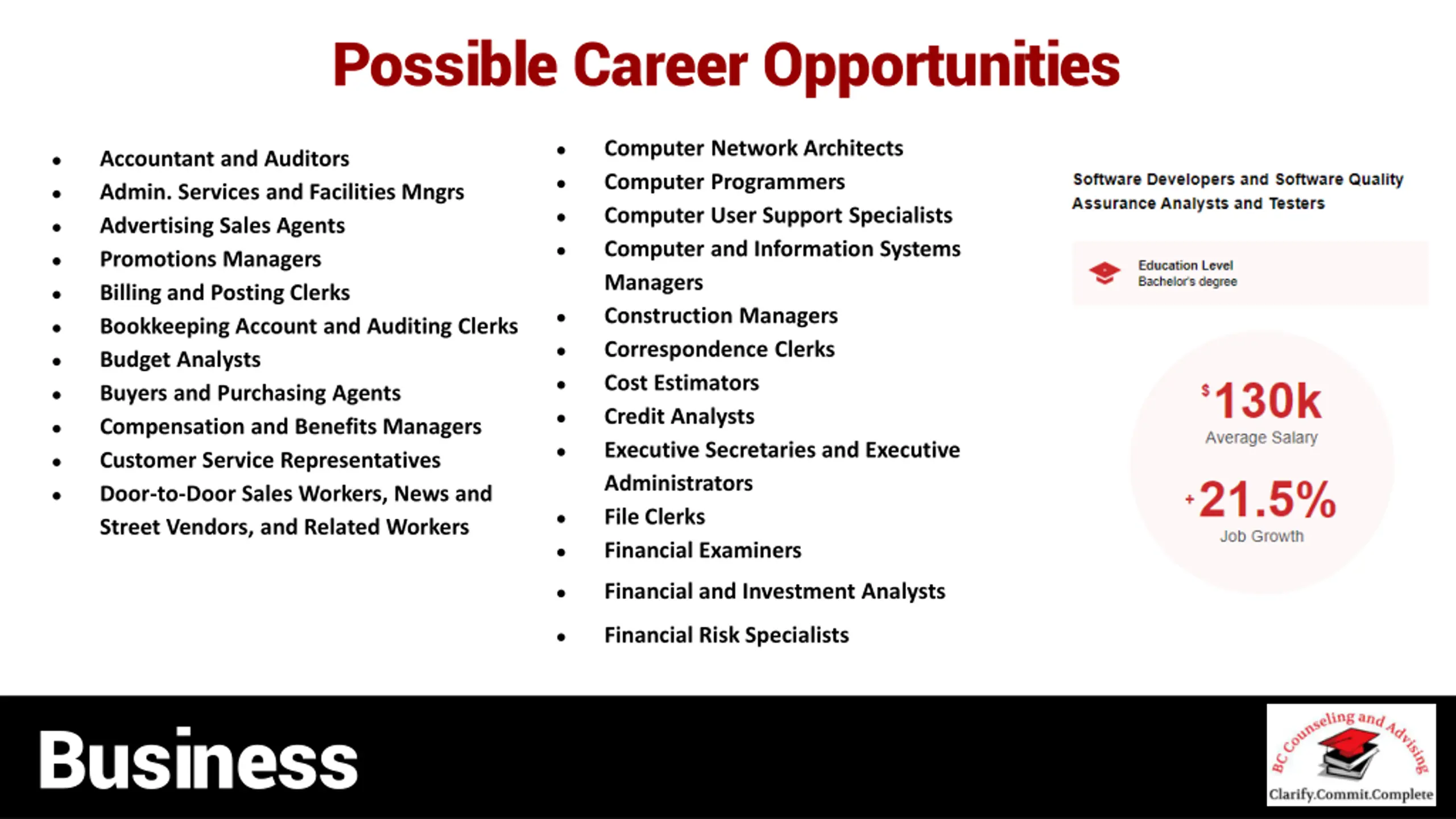 Possible Career Opportunities Computer Network Architects Computer Programmers Computer User Support Specialists Computer and Information Systems Managers Construction Managers Correspondence Clerks Cost Estimators Credit Analysts Executive Secretaries and Executive Administrators File Clerks Financial Examiners Accountant and Auditors Admin. Services and Facilities Mngrs Advertising Sales Agents Promotions Managers Billing and Posting Clerks Bookkeeping Account and Auditing Clerks Budget Analysts Buyers and Purchasing Agents Compensation and Benefits Managers Customer Service Representatives Door-to-Door Sales Workers, News and Street Vendors, and Related Workers Financial and Investment Analysts Financial Risk Specialists Business