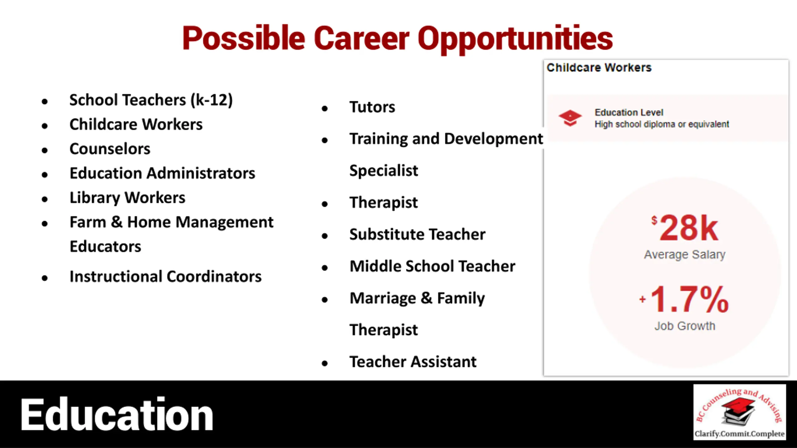 Possible Career Opportunities School Teachers (k-12) Childcare Workers Counselors Education Administrators Library Workers Farm & Home Management Educators Tutors Training and Development Specialist Therapist Substitute Teacher Middle School Teacher Instructional Coordinators Marriage & Family Therapist Teacher Assistant Education