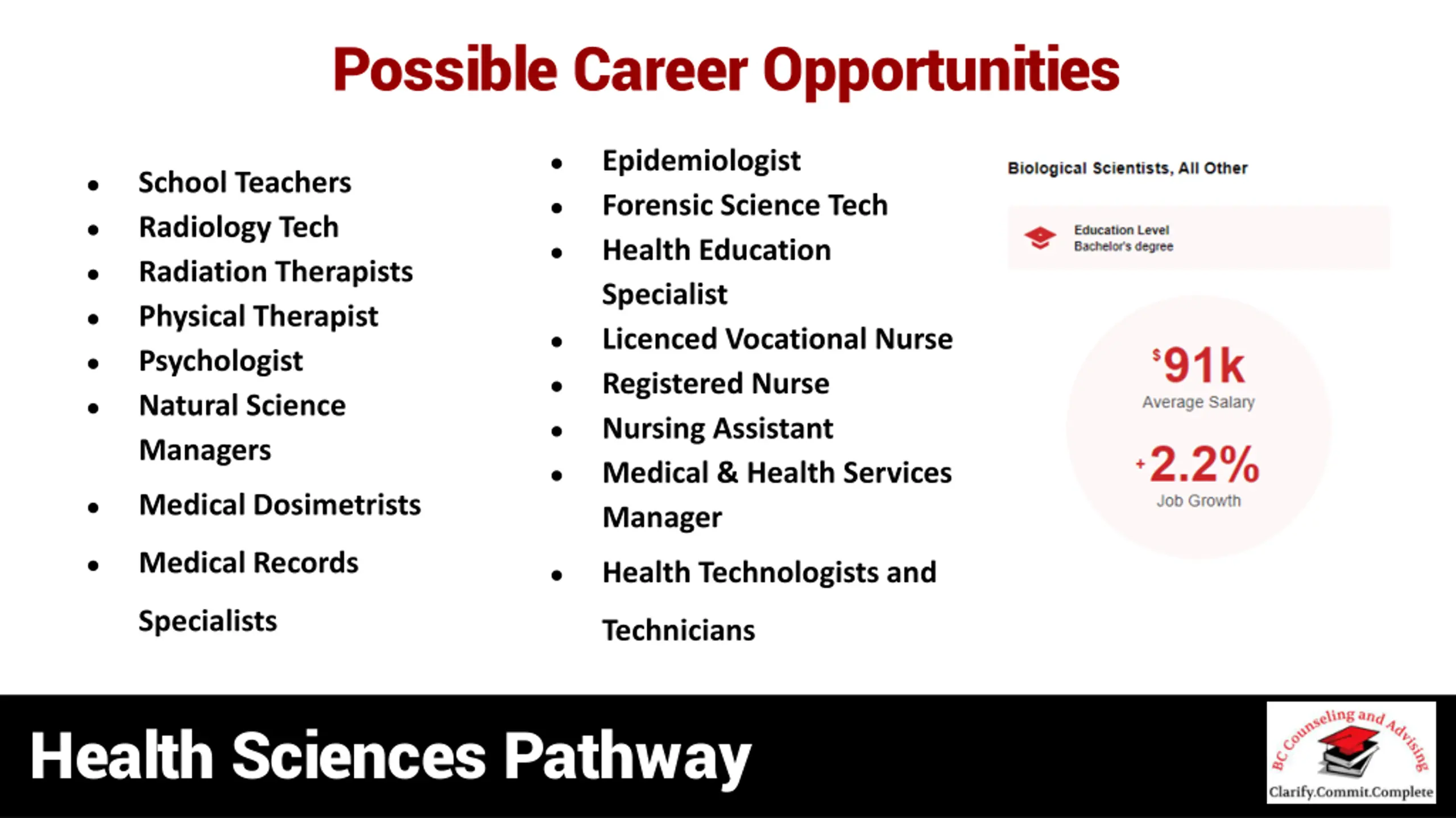 Possible Career Opportunities Epidemiologist Forensic Science Tech Health Education Specialist Licenced Vocational Nurse Registered Nurse Nursing Assistant Medical & Health Services Manager School Teachers Radiology Tech Radiation Therapists Physical Therapist Psychologist Natural Science Managers Medical Dosimetrists Medical Records Health Technologists and Specialists Technicians Health Sciences Pathway