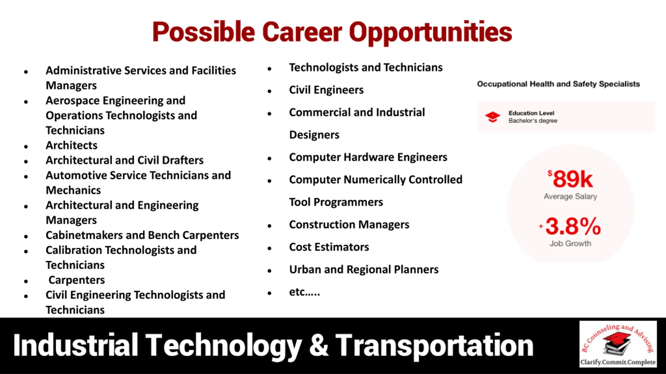 Possible Career Opportunities Technologists and Technicians Administrative Services and Facilities Managers Aerospace Engineering and Operations Technologists and Technicians Architects Architectural and Civil Drafters Automotive Service Technicians and Mechanics Architectural and Engineering Managers Cabinetmakers and Bench Carpenters Calibration Technologists and Technicians Carpenters Civil Engineering Technologists and Technicians Industrial Technology & Transportation Civil Engineers Commercial and Industrial Designers Computer Hardware Engineers Computer Numerically Controlled Tool Programmers Construction Managers Cost Estimators Urban and Regional Planners etc ..