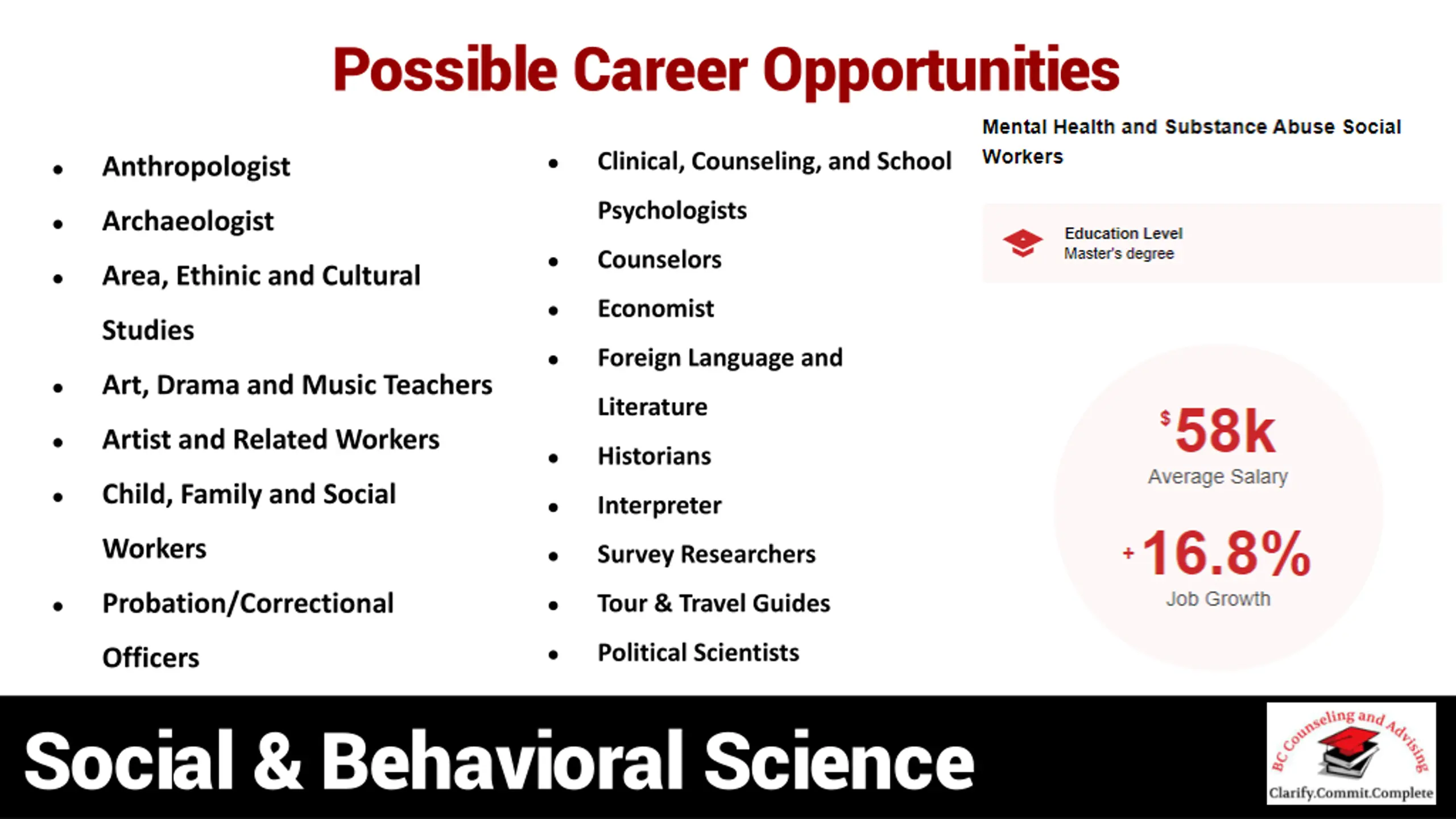Possible Career Opportunities Clinical, Counseling, and School Anthropologist Psychologists Archaeologist Counselors Area, Ethinic and Cultural Economist Studies Foreign Language and Art, Drama and Music Teachers Literature Artist and Related Workers Historians Child, Family and Social Interpreter Workers Survey Researchers Probation/Correctional Tour & Travel Guides Political Scientists Officers Social & Behavioral Science