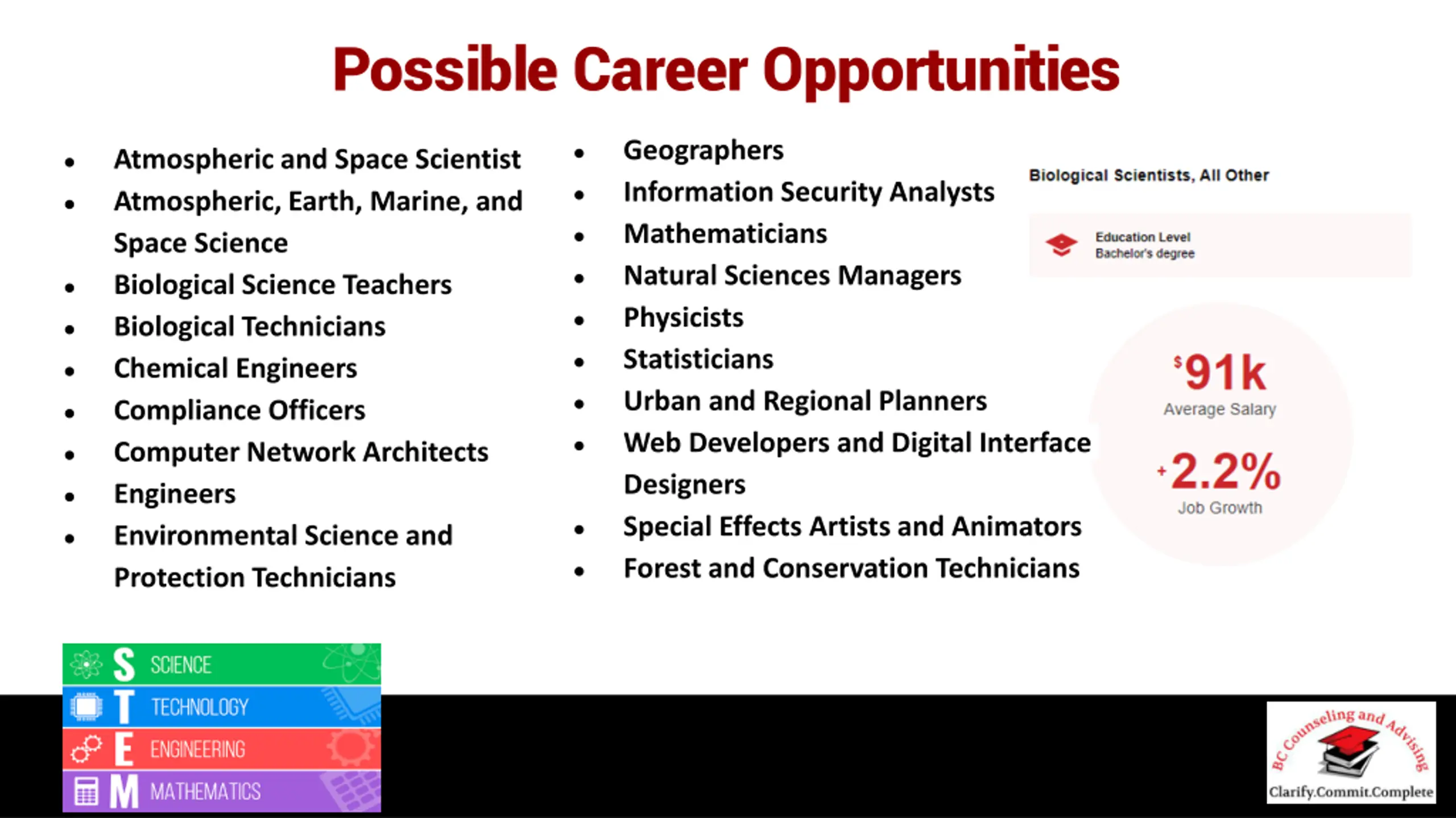 Possible Career Opportunities Geographers Information Security Analysts Mathematicians Natural Sciences Managers Physicists Statisticians Urban and Regional Planners Web Developers and Digital Interface Designers Special Effects Artists and Animators Forest and Conservation Technicians Atmospheric and Space Scientist Atmospheric, Earth, Marine, and Space Science Biological Science Teachers Biological Technicians Chemical Engineers Compliance Officers Computer Network Architects Engineers Environmental Science and Protection Technicians