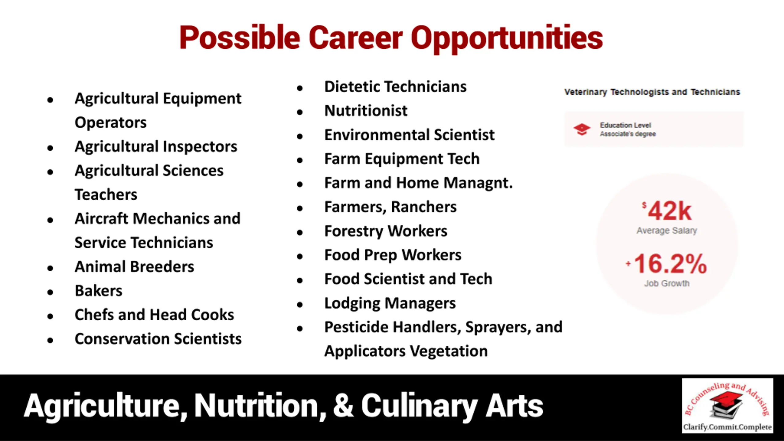 Possible Career Opportunities Dietetic Technicians Nutritionist Environmental Scientist Farm Equipment Tech Farm and Home Managnt. Farmers, Ranchers Forestry Workers Food Prep Workers Food Scientist and Tech Lodging Managers Pesticide Handlers, Sprayers, and Applicators Vegetation Agricultural Equipment Operators Agricultural Inspectors Agricultural Sciences Teachers Aircraft Mechanics and Service Technicians Animal Breeders Bakers Chefs and Head Cooks Conservation Scientists Agriculture, Nutrition, & Culinary Arts