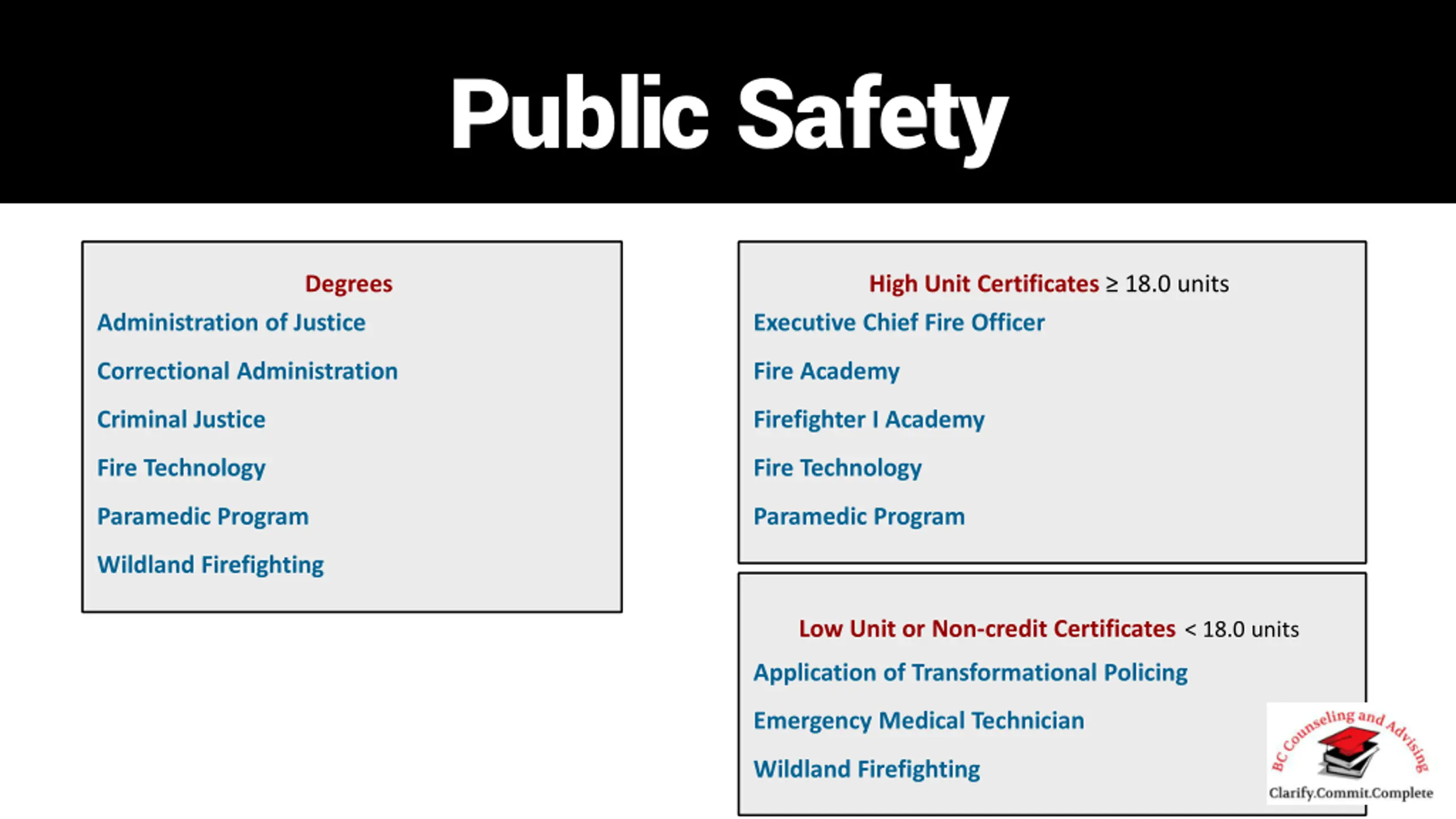 Public Safety Degrees High Unit Certificates 18.0 units Executive Chief Fire Officer Administration of Justice Correctional Administration Fire Academy Criminal Justice Firefighter I Academy Fire Technology Fire Technology Paramedic Program Paramedic Program Wildland Firefighting Low Unit or Non-credit Certificates< 18.0 units Application of Transformational Policing Emergency Medical Technician Wildland Firefighting