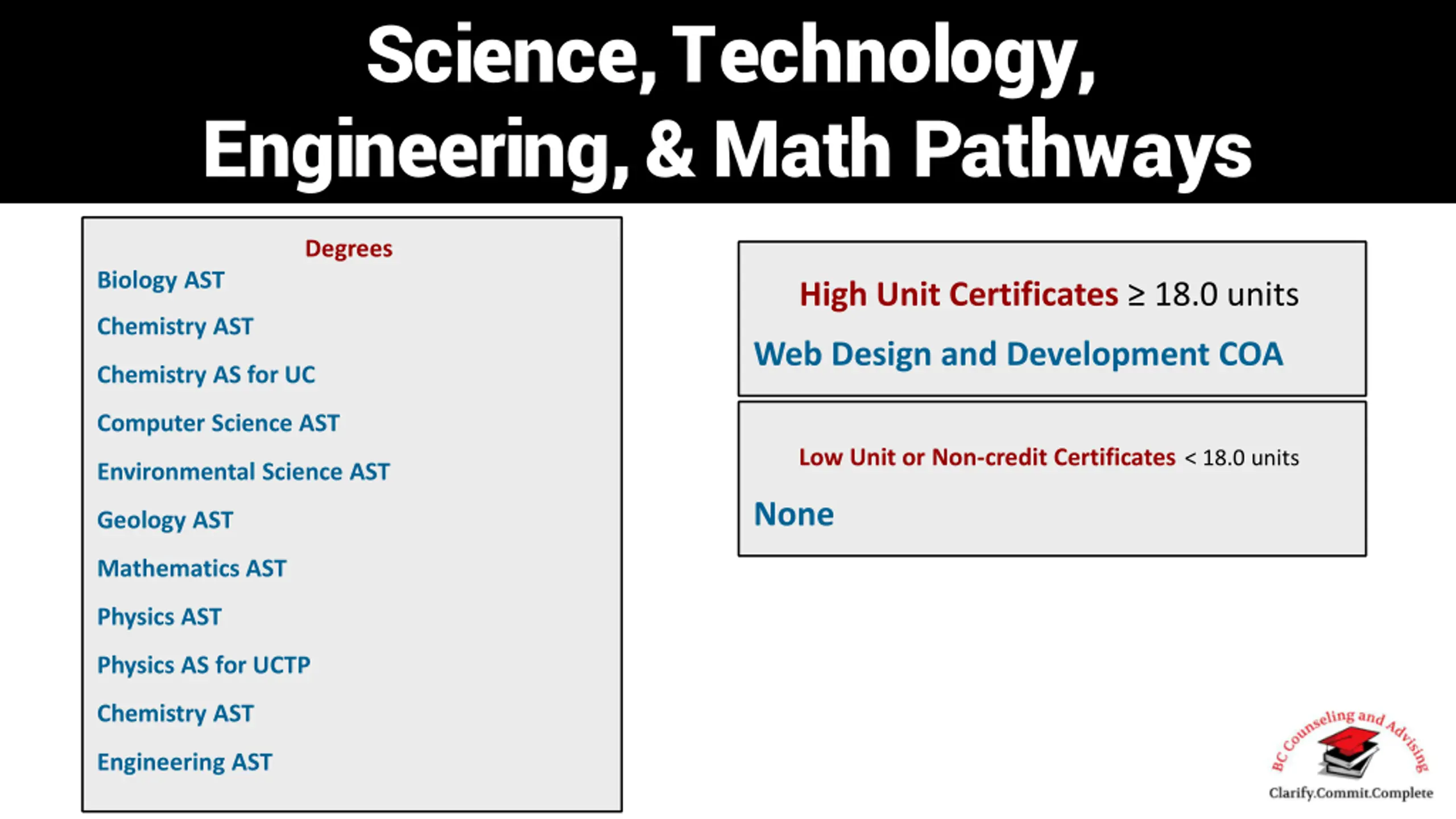 Science, Technology, Engineering, & Math Pathways Degrees Biology AST High Unit Certificates 18.0 units Chemistry AST Web Design and Development COA Chemistry AS for UC Computer Science AST Low Unit or Non-credit Certificates< 18.0 units Environmental Science AST None Geology AST Mathematics AST Physics AST Physics AS for UCTP Chemistry AST Engineering AST