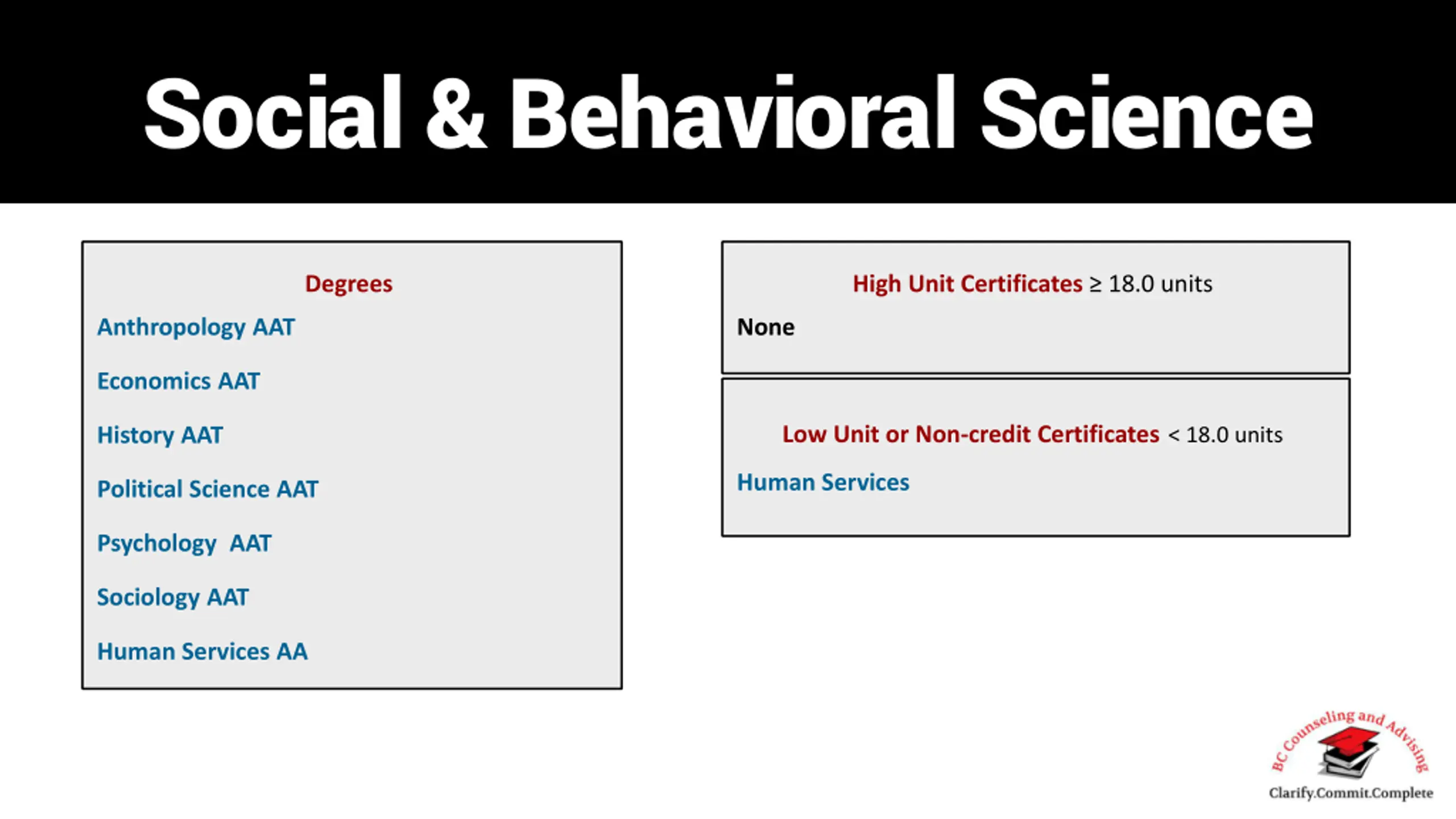 Social & Behavioral Science Degrees High Unit Certificates 18.0 units Anthropology AAT None Economics AAT Low Unit or Non-credit Certificates< 18.0 units History AAT Human Services Political Science AAT Psychology AAT Sociology AAT Human Services AA