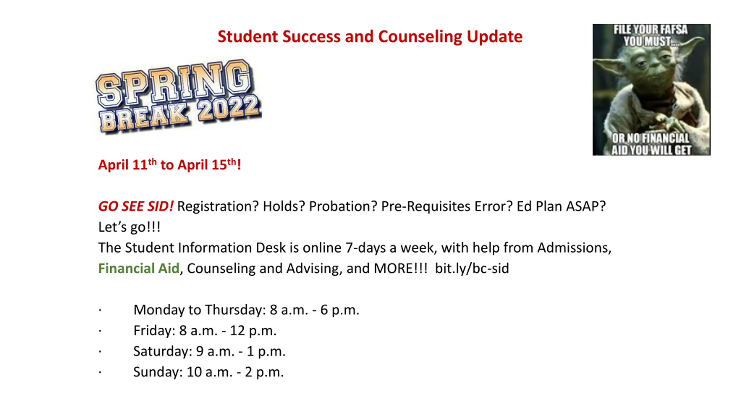 Student Success and Counseling Update April 11thto April 15th! GO SEE SID! Registration? Holds? Probation? Pre-Requisites Error? Ed Plan ASAP? Let s go!!! The Student Information Desk is online 7-days a week, with help from Admissions, Financial Aid, Counseling and Advising, and MORE!!! bit.ly/bc-sid Monday to Thursday: 8 a.m. - 6 p.m. Friday: 8 a.m. - 12 p.m. Saturday: 9 a.m. - 1 p.m. Sunday: 10 a.m. - 2 p.m.